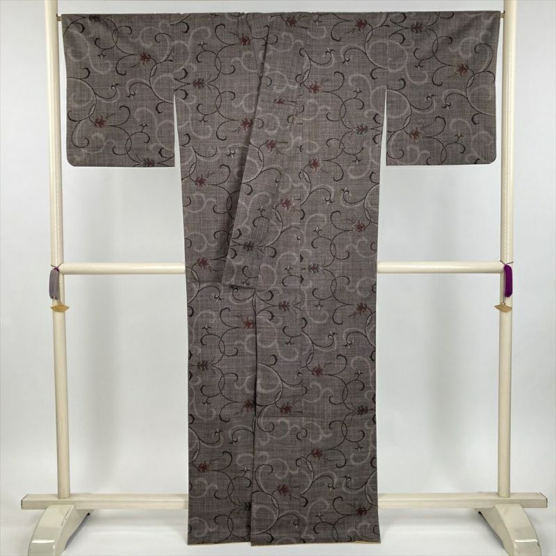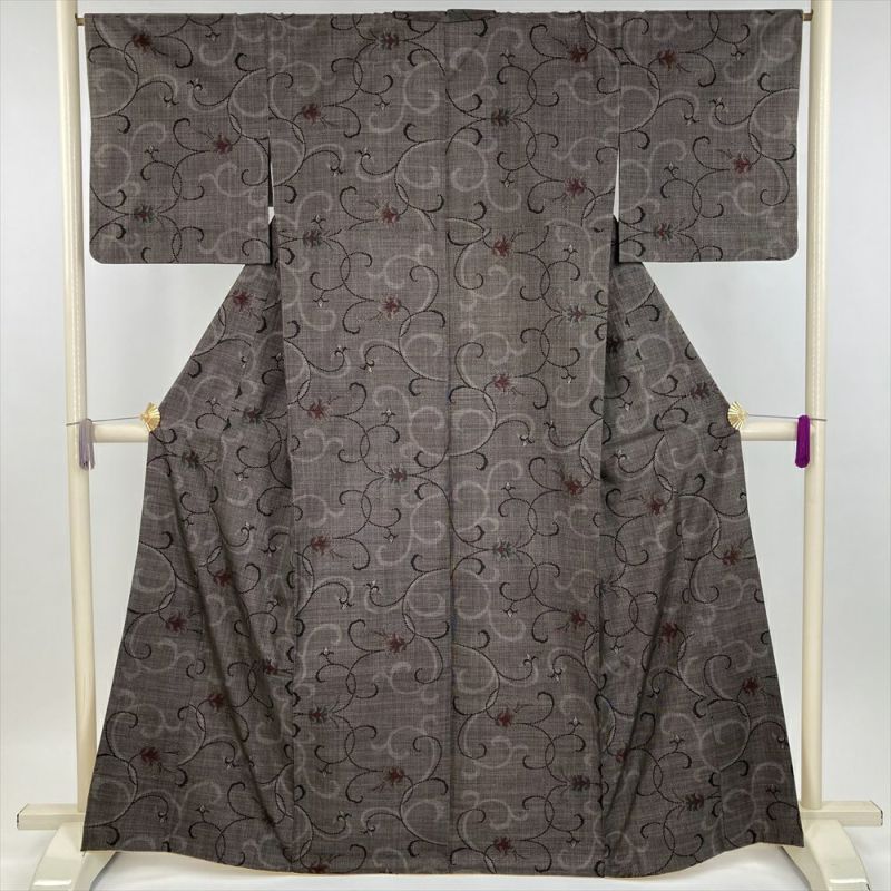 (中古) 大島紬 焦げ茶 カジュアル 花唐草 袷 絹【身丈】159.5cm【裄丈】67cm