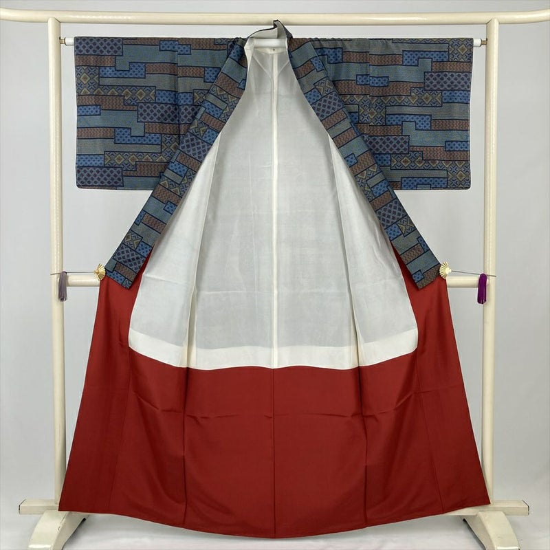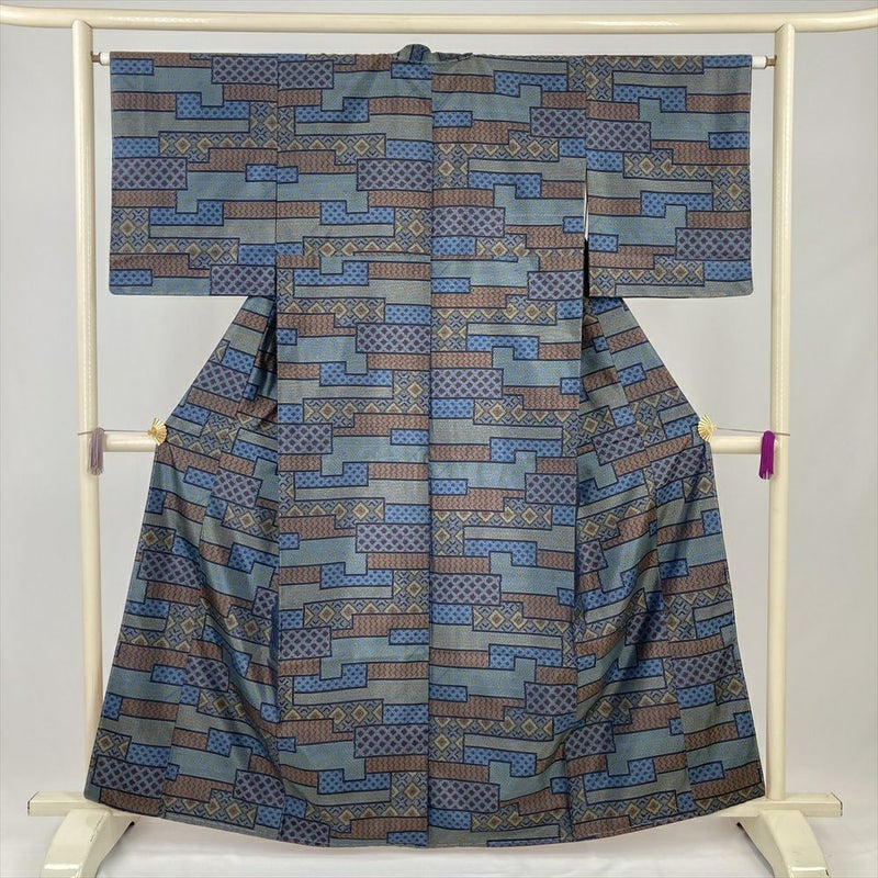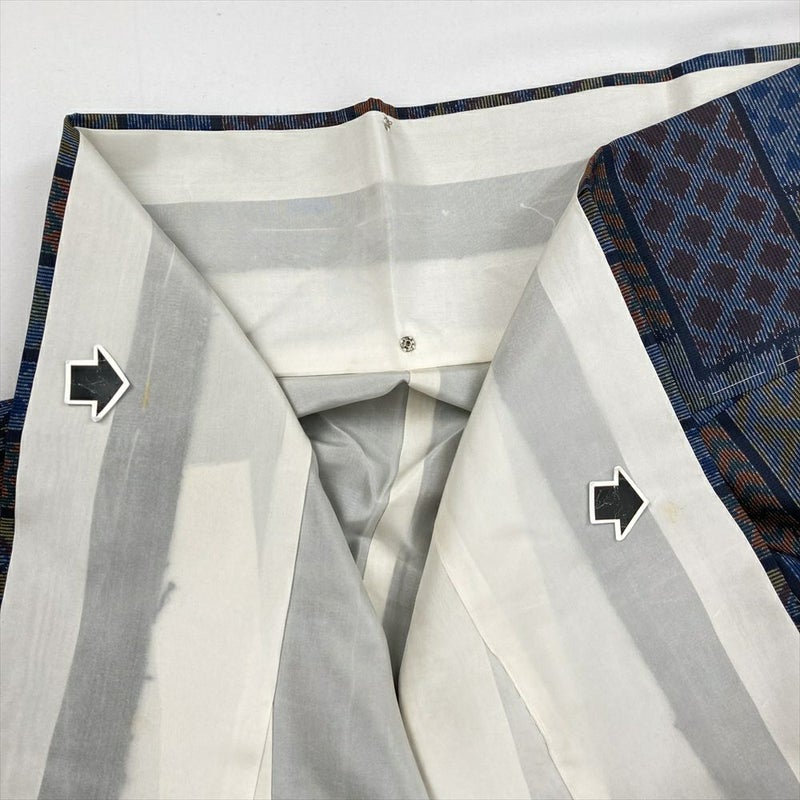 (中古) 大島紬 紺 青 カジュアル 変わり横段 幾何学柄 袷 絹【身丈】157cm【裄丈】64cm