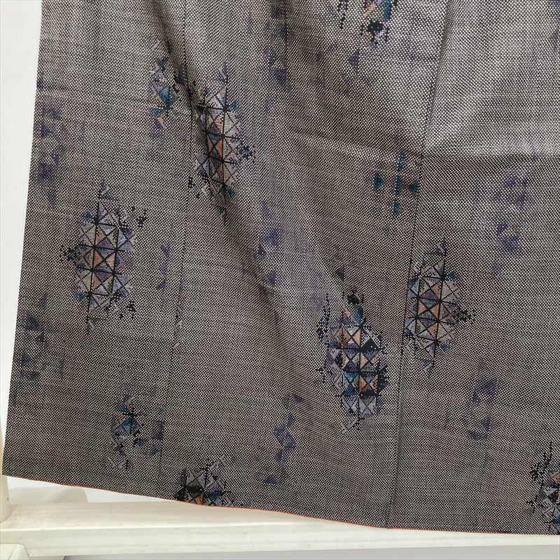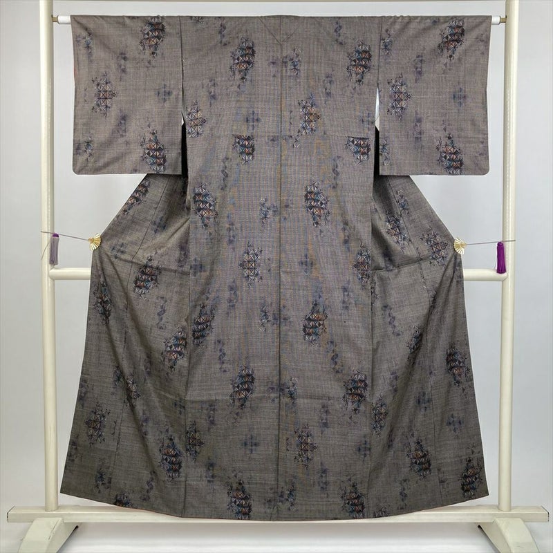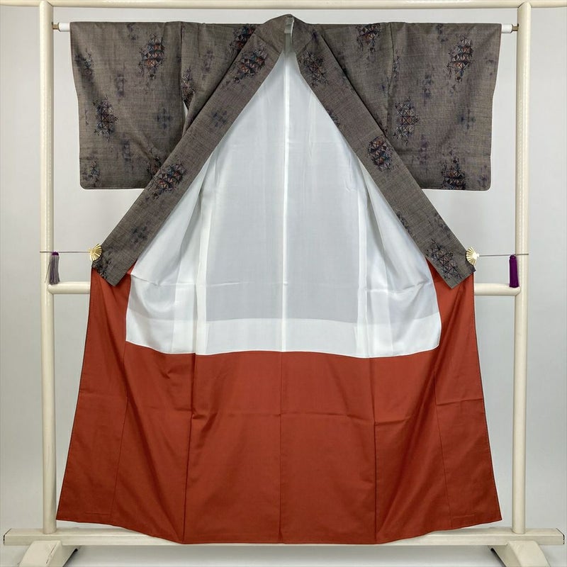 (中古) 大島紬 焦げ茶色 カジュアル 幾何学 袷 絹 【身丈】152.5cm【裄丈】63cm