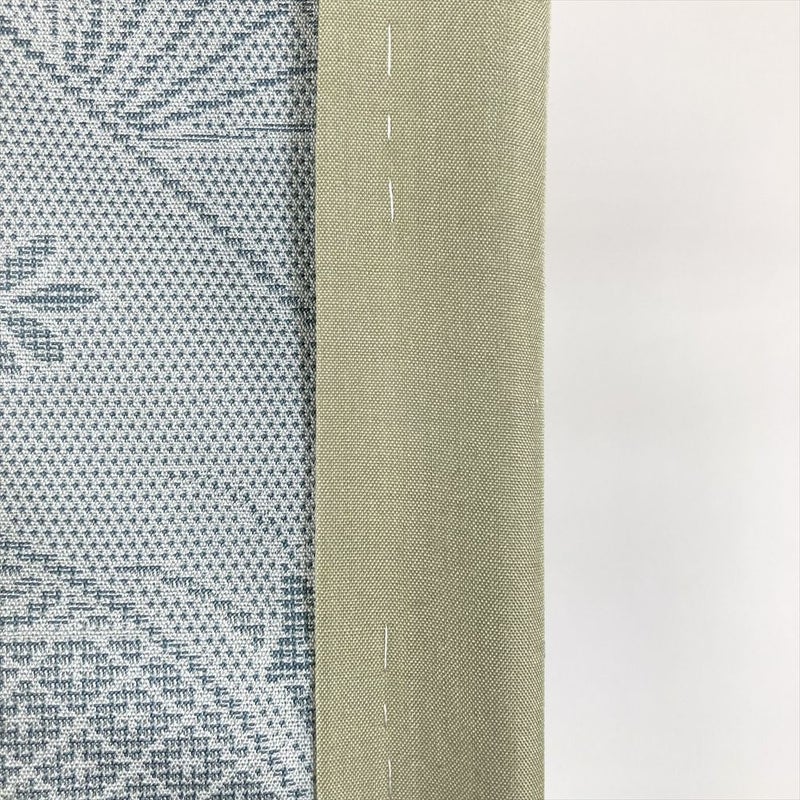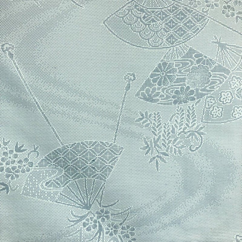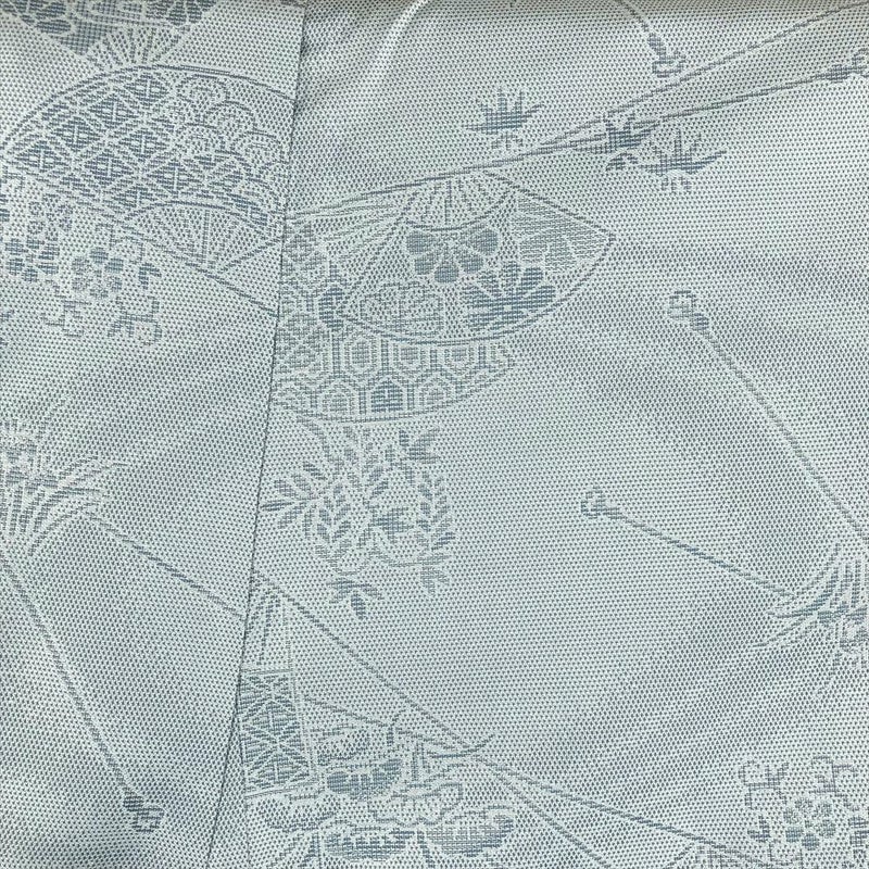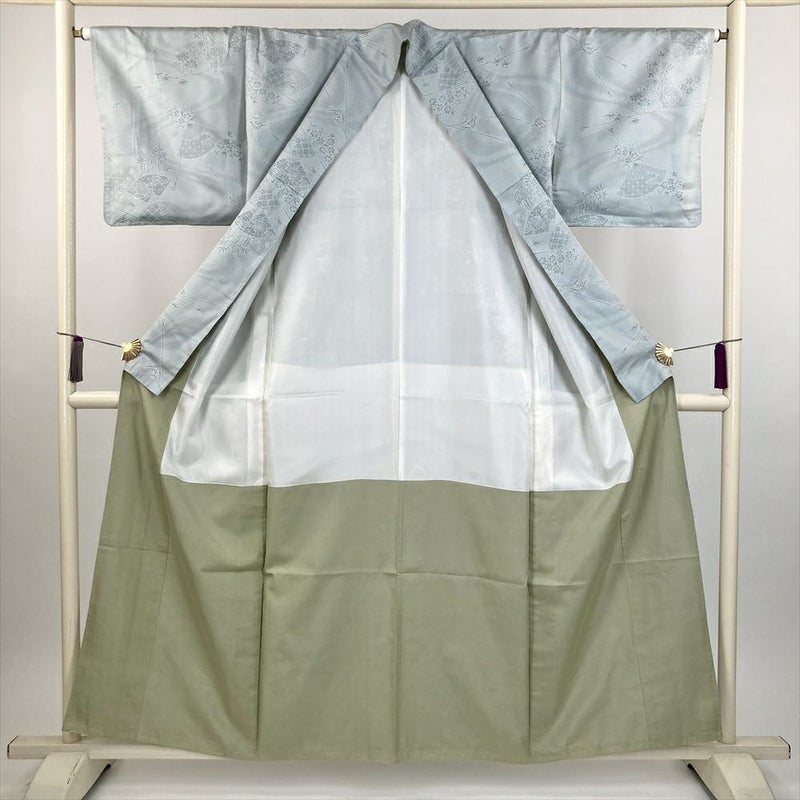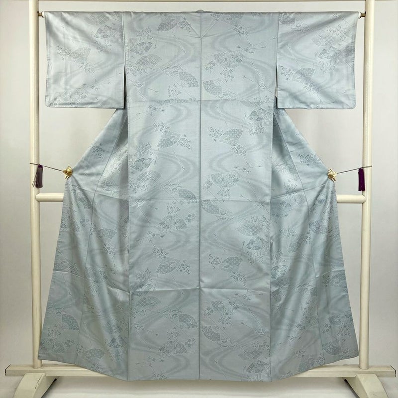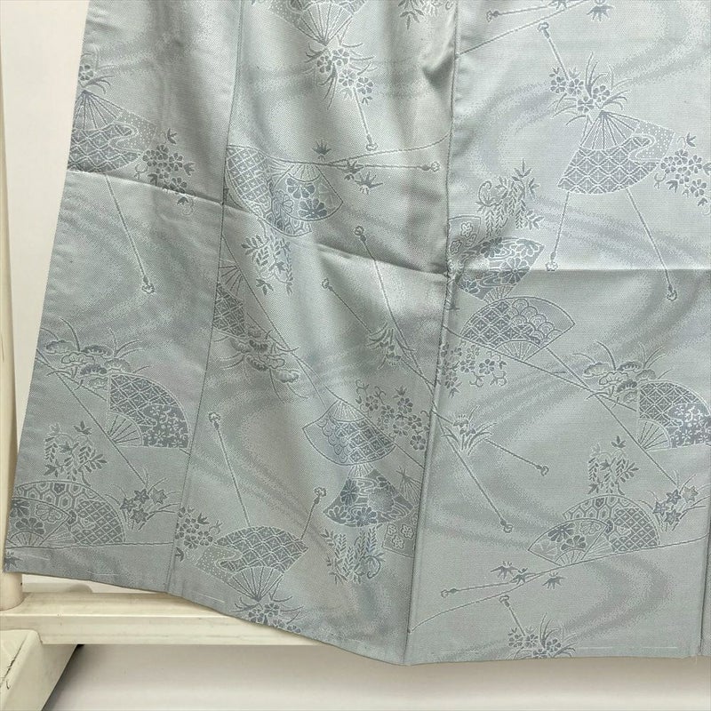 (中古) 紬 灰緑 水色 カジュアル 扇子 四季花 袷 絹 【身丈】153cm【裄丈】65cm