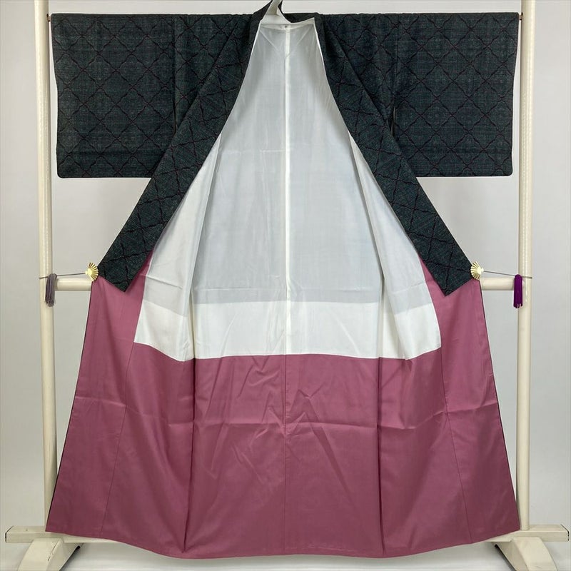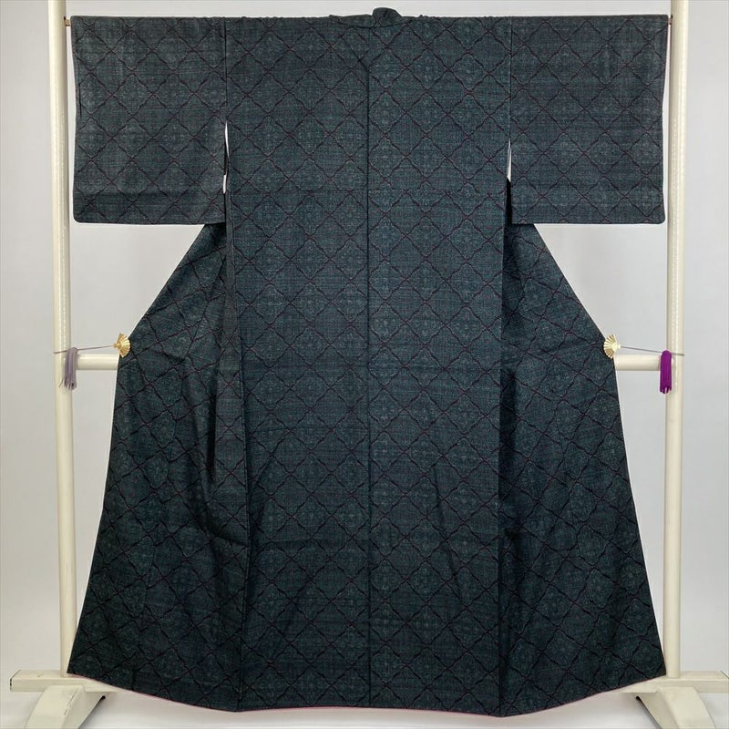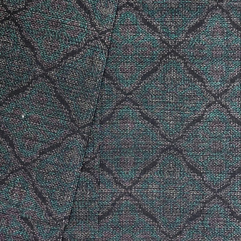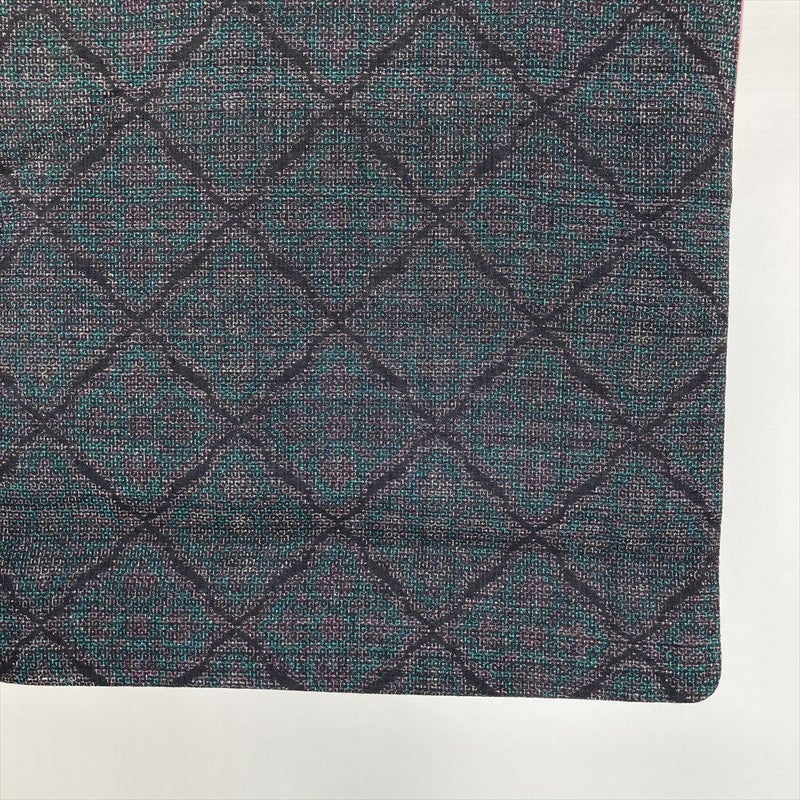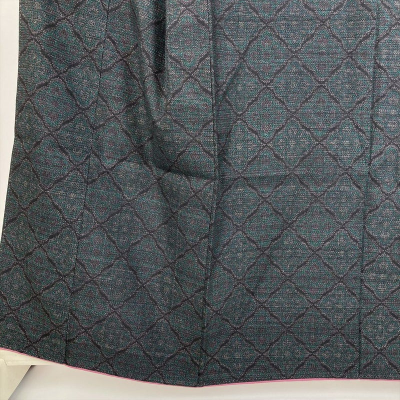 (中古) 紬 黒 緑 カジュアル 変わり花菱 袷 絹【身丈】153.5cm【裄丈】67cm