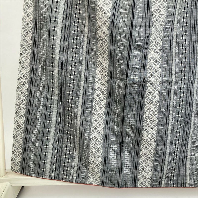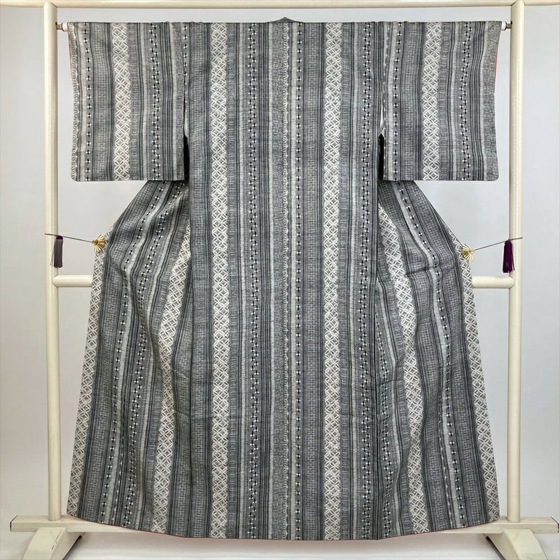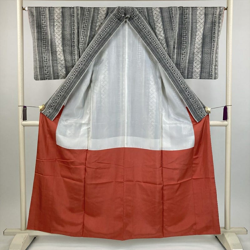 (中古) 紬 グレー カジュアル 縞 亀甲 十字 袷 絹 【身丈】154cm【裄丈】65.5cm