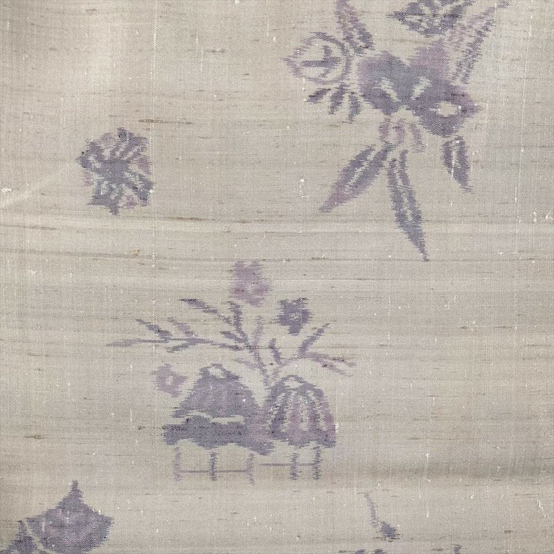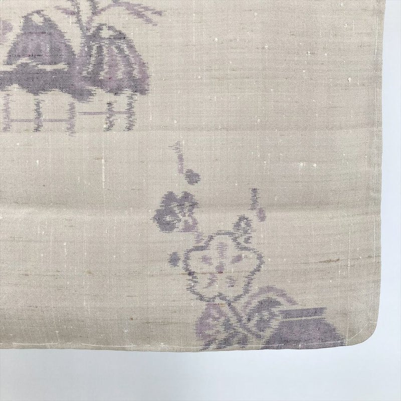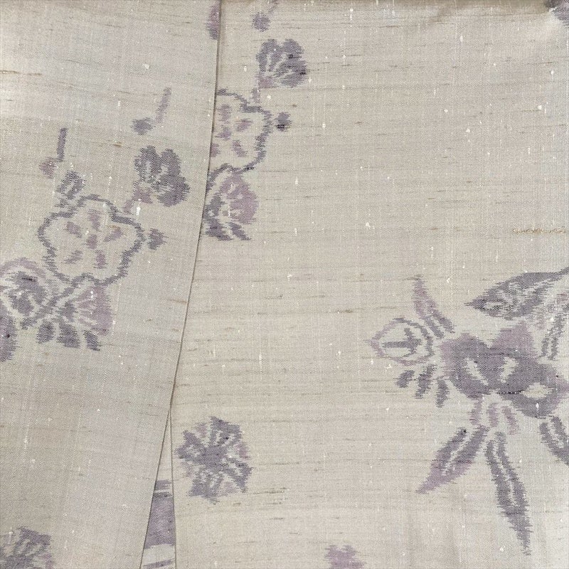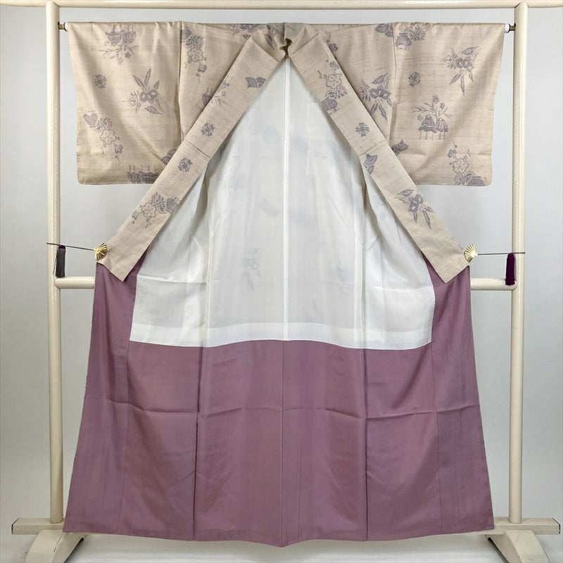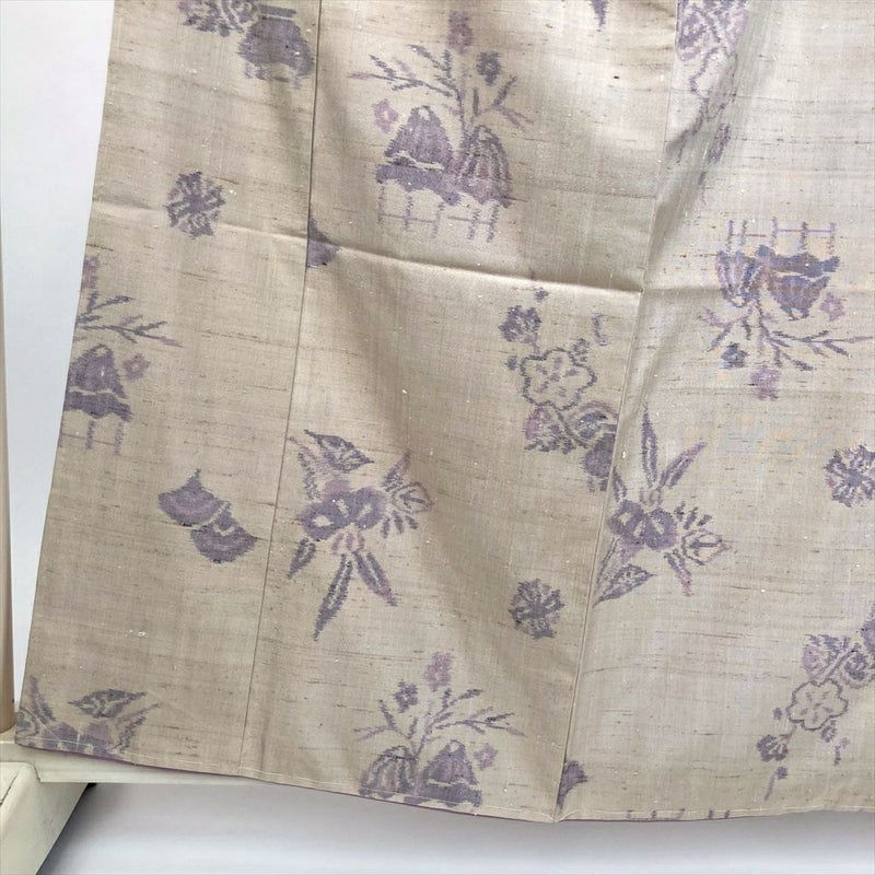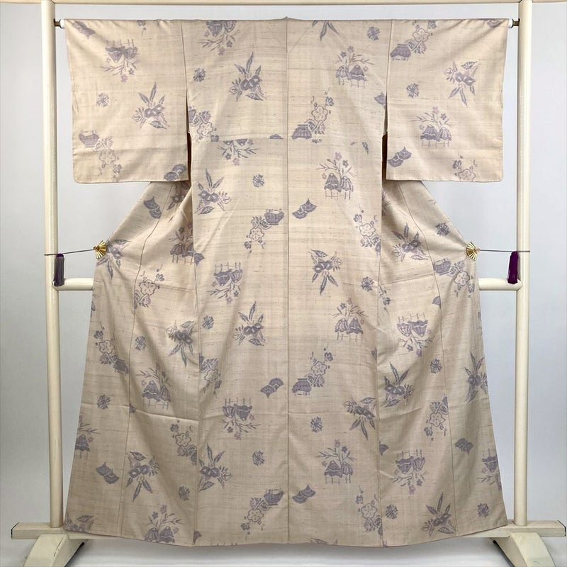 (中古) 紬 白茶 薄ベージュ カジュアル 家屋文 四季花 袷 絹 【身丈】154cm【裄丈】65cm