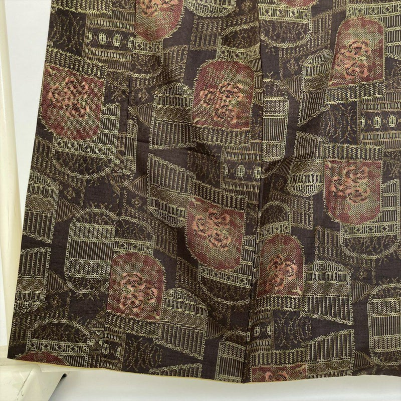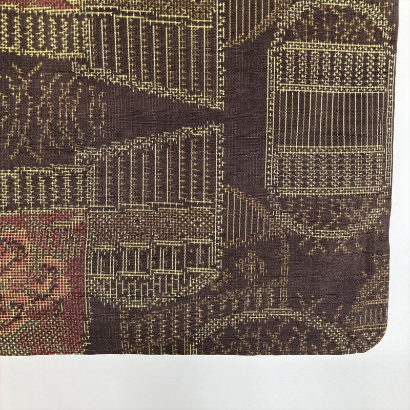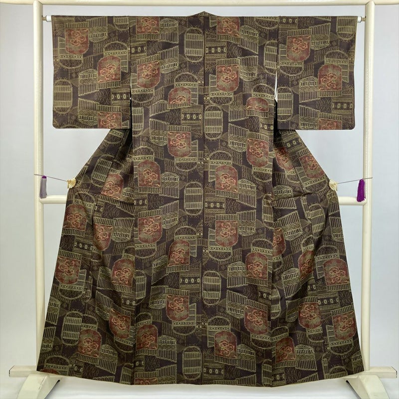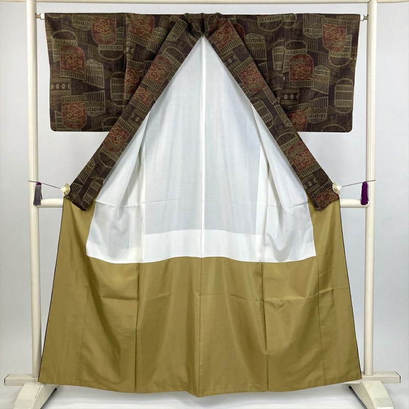 (中古) 紬 茶 カジュアル 花柄衝立 袷 絹 【身丈】155.5cm【裄丈】60.5cm