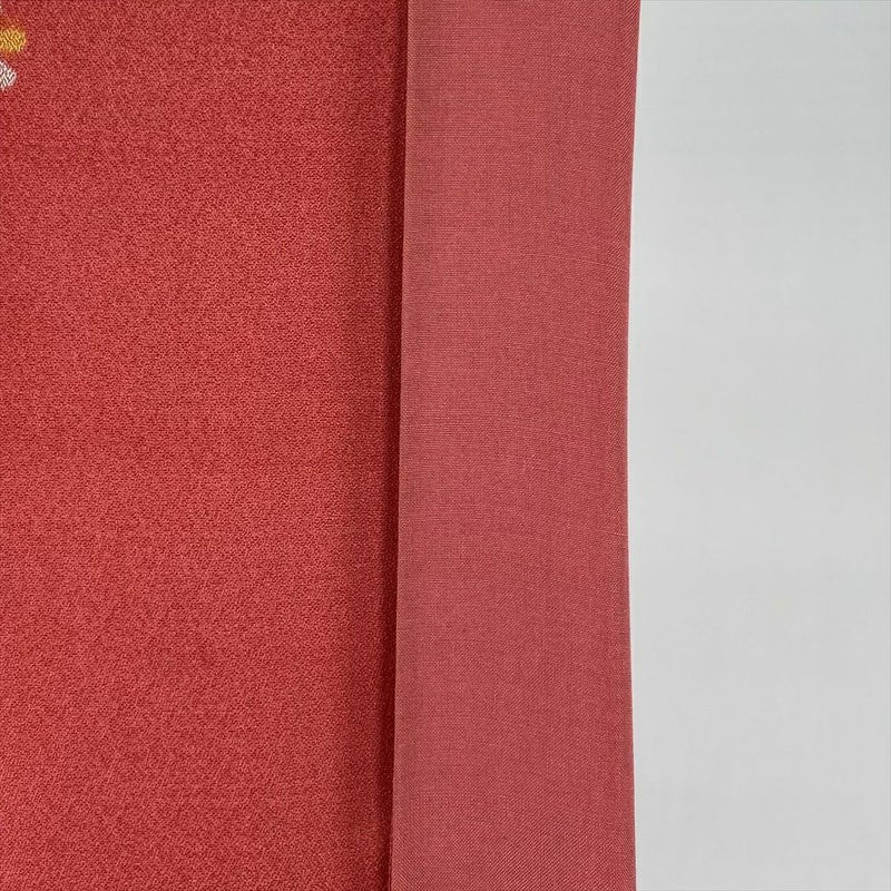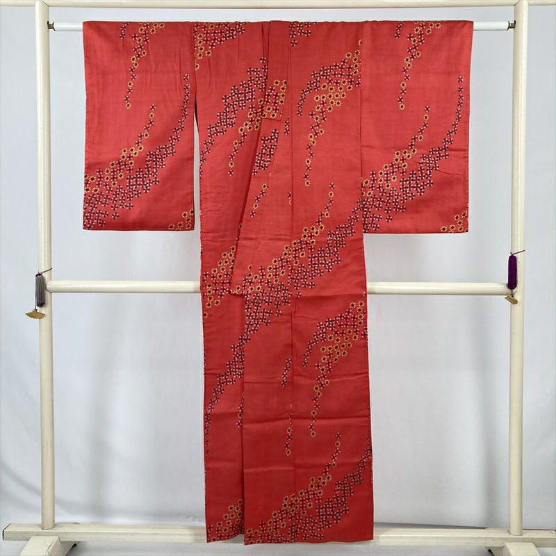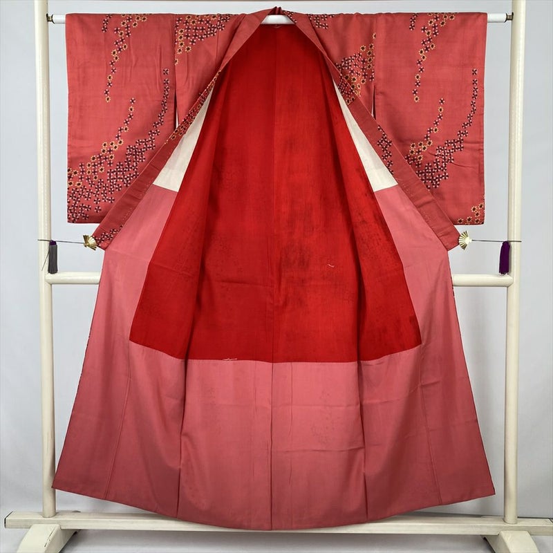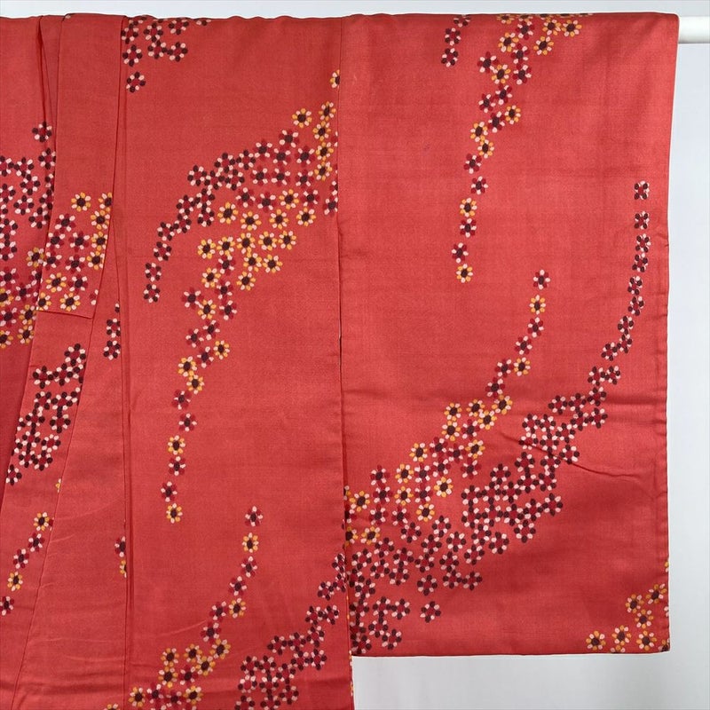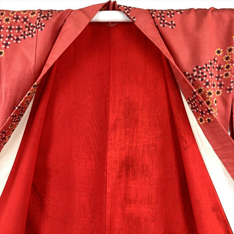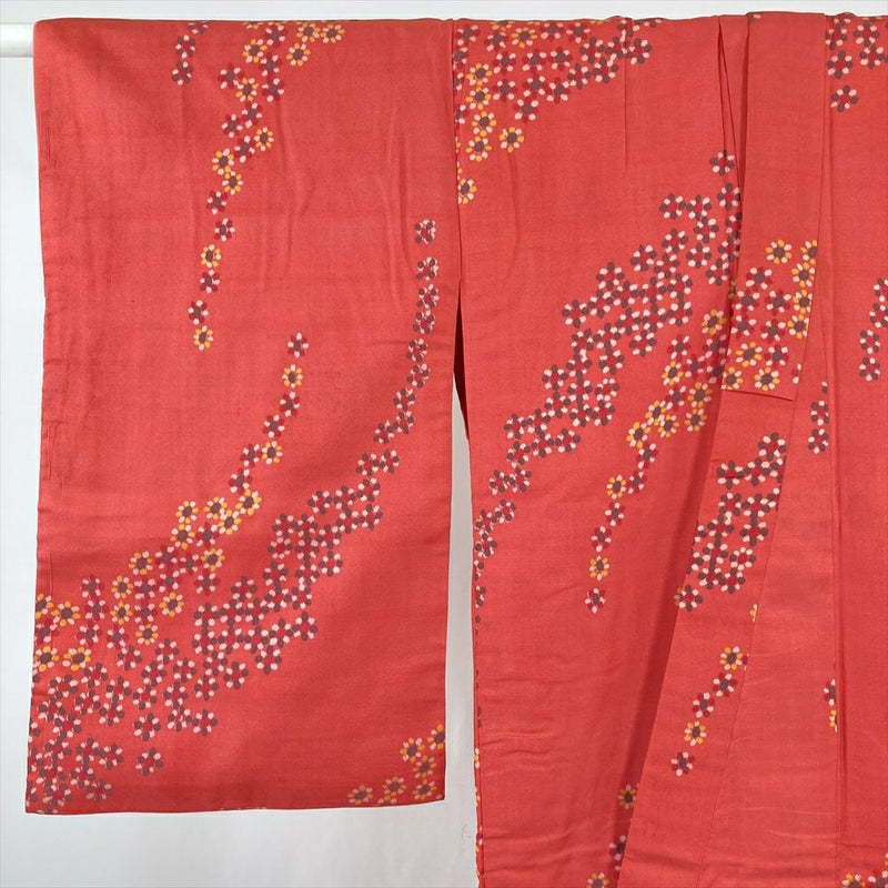 (中古) 紬 濃珊瑚 濃ピンク ヴィンテージ 小花 袷 絹【身丈】148cm【裄丈】62cm