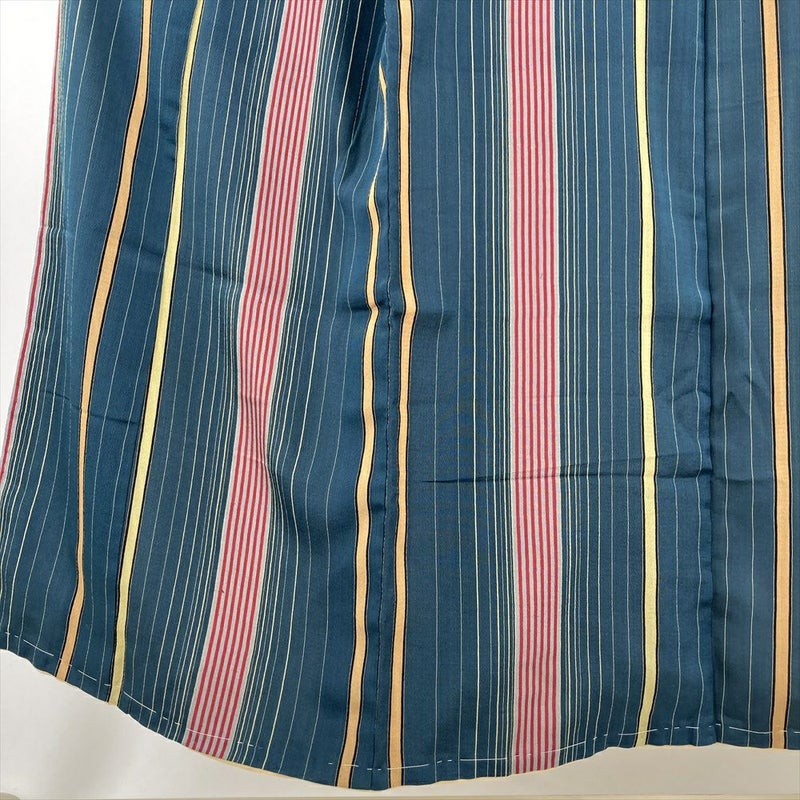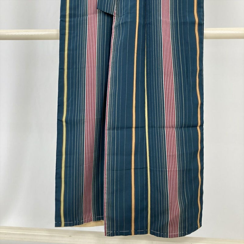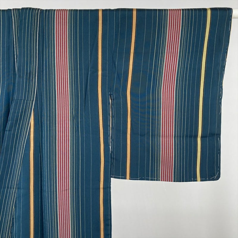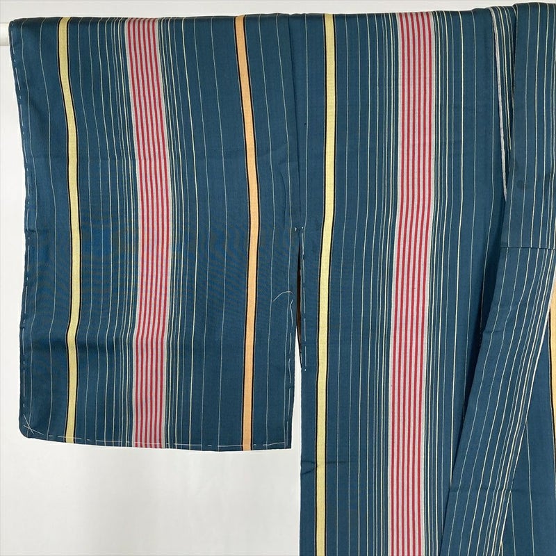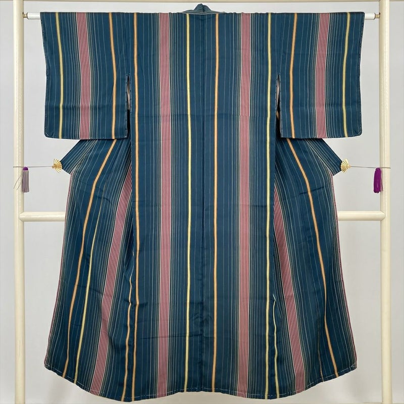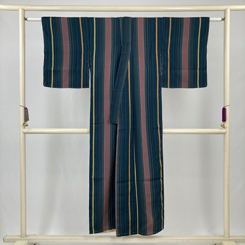(中古) 紬 青緑 ヴィンテージ 縞 袷 絹【身丈】142cm【裄丈】61.5cm