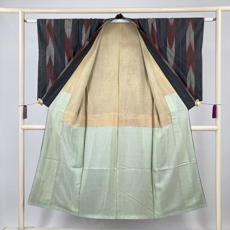 モダンな矢羽根絣が全体に施され、古き良き日本の雰囲気を漂わせています。