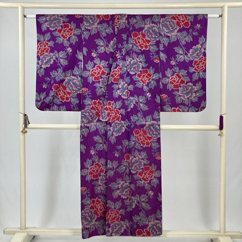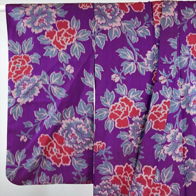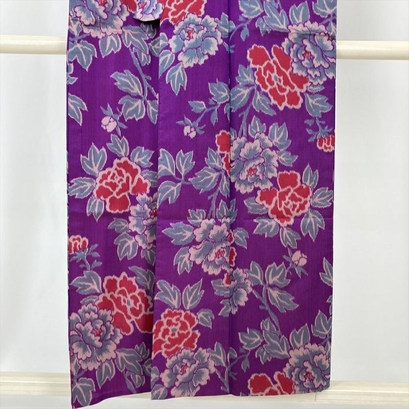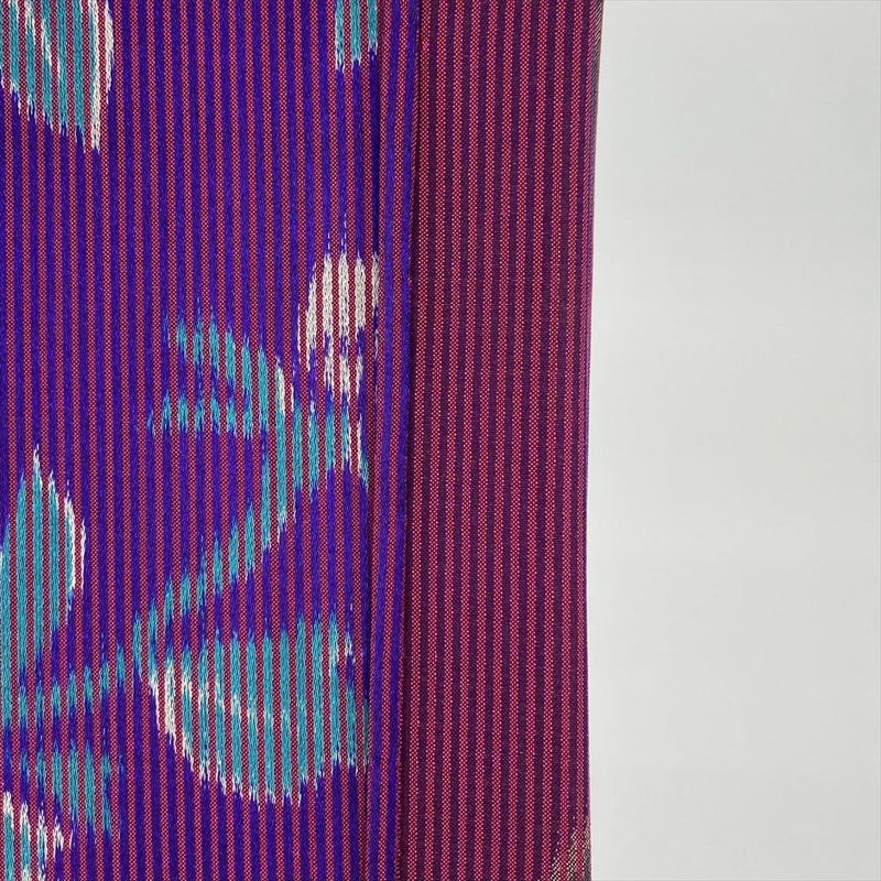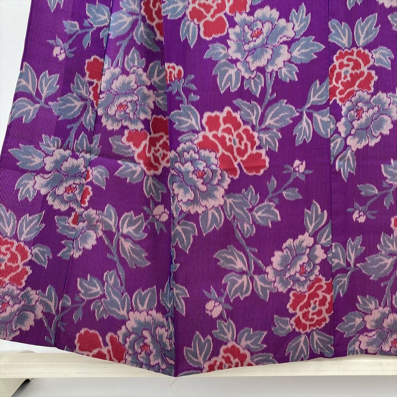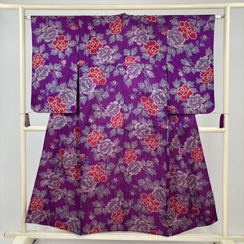 (中古) 紬 紫 ヴィンテージ 縞 牡丹 単衣 絹【身丈】147.5cm【裄丈】63.5cm