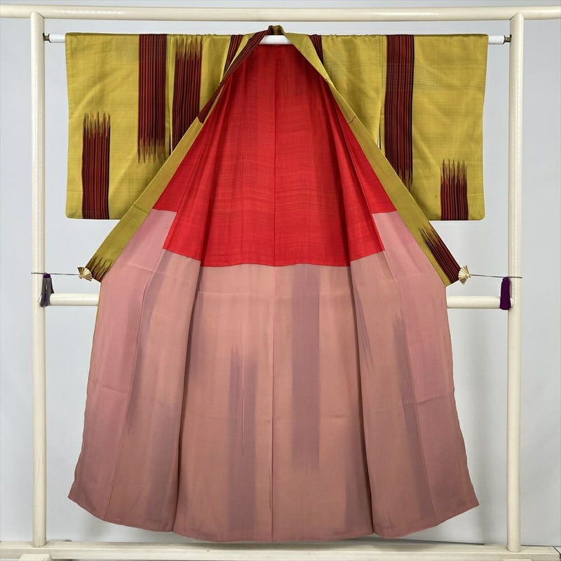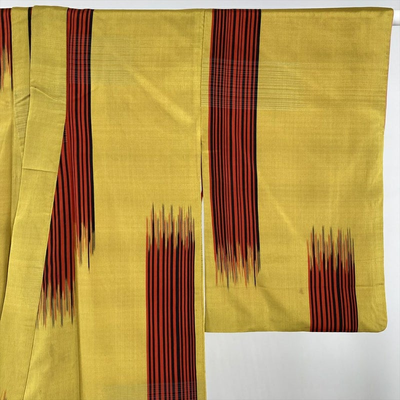 (中古) 紬 黄色 ヴィンテージ 縞 袷 絹【身丈】144.5cm【裄丈】62.5cm