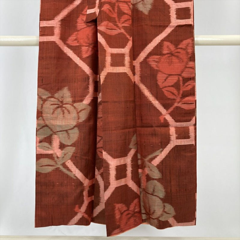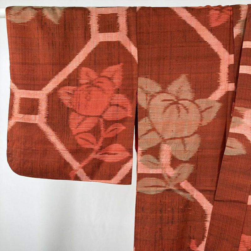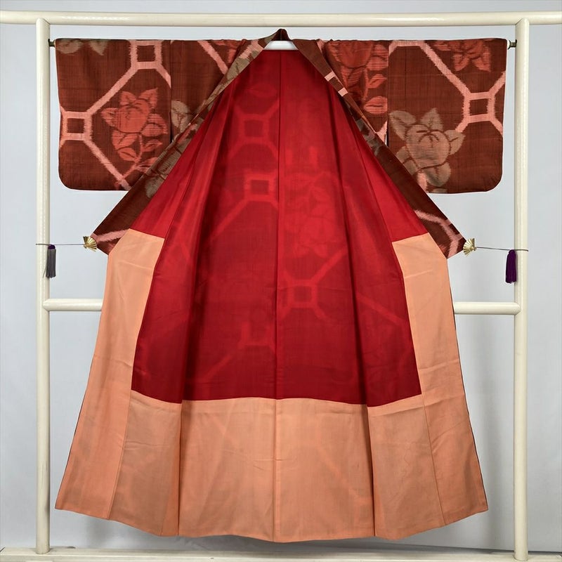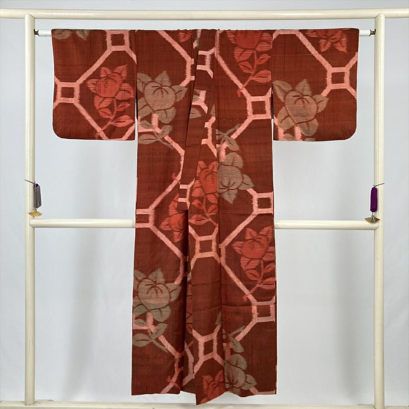 (中古) 紬 柿色 赤 オレンジ ヴィンテージ 蜀江文 橘 袷 絹【身丈】140.5cm【裄丈】66cm