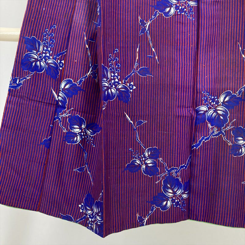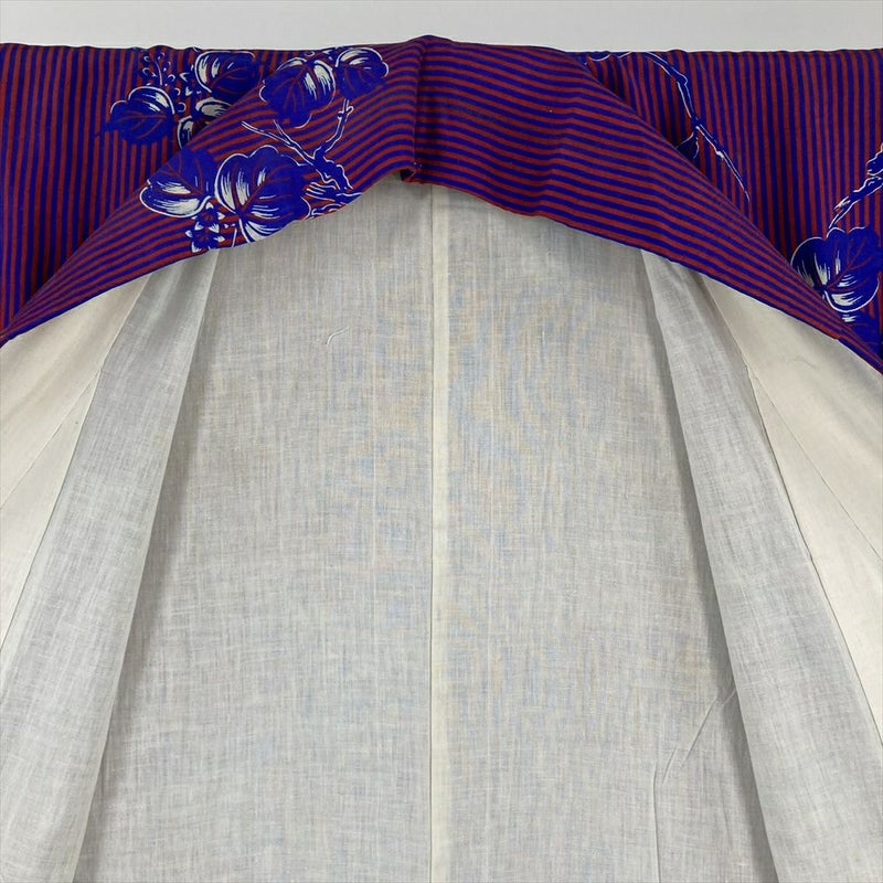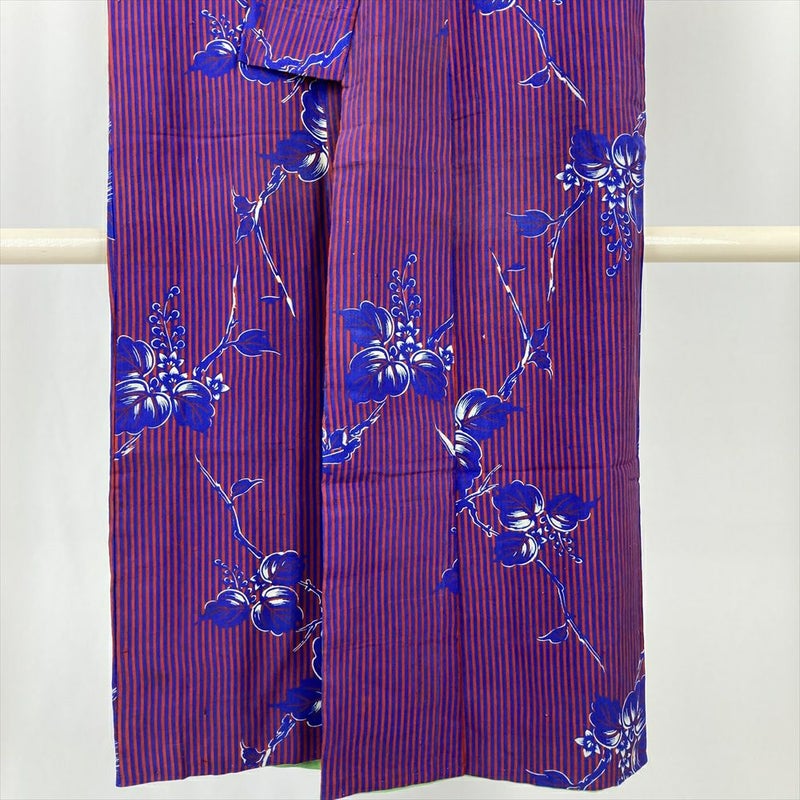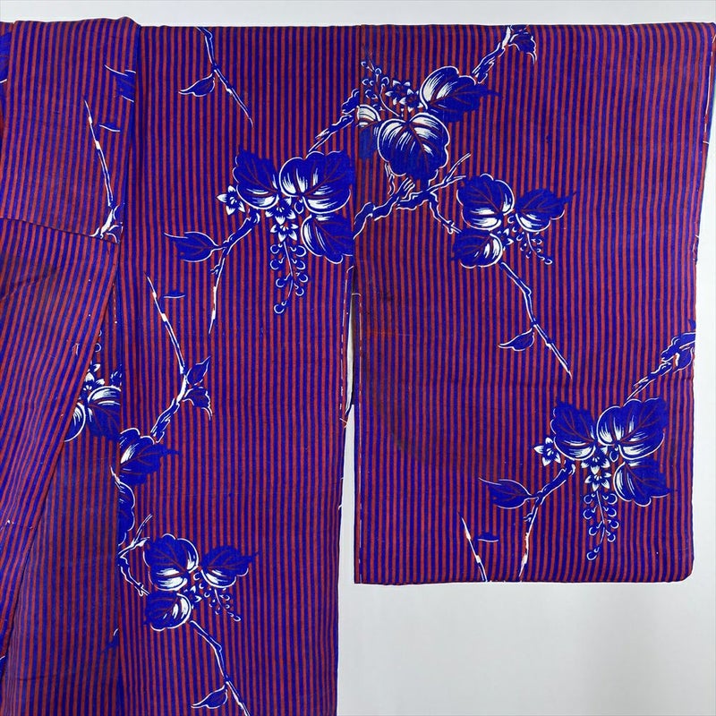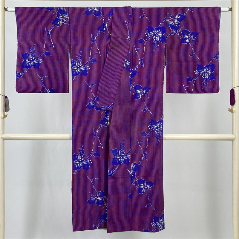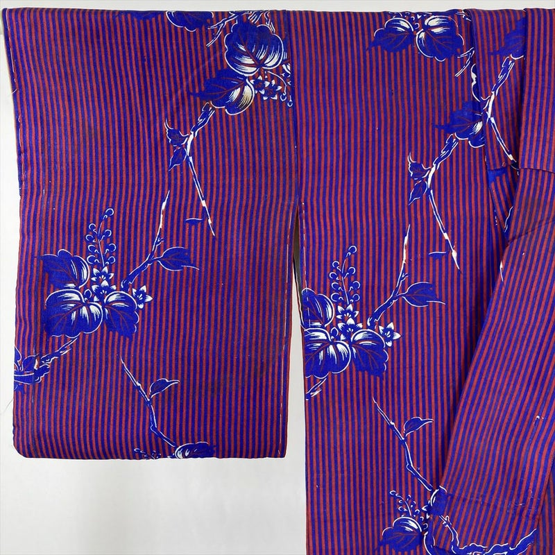 情熱的な赤とクールな青の縞柄、そして愛らしい桐の花が染め出されたヴィンテージ着物です。