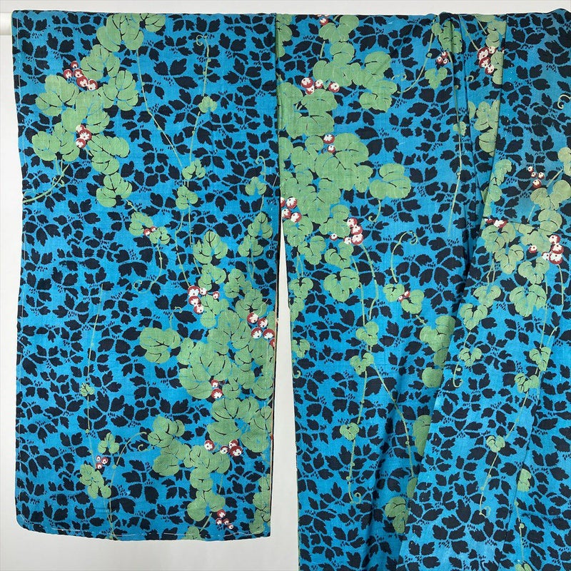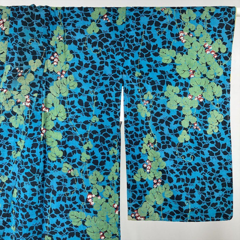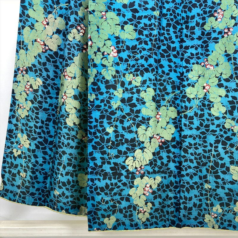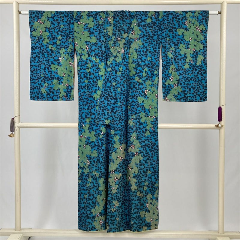 (中古) 紬 青緑 ヴィンテージ 果実 袷 絹【身丈】144.5cm【裄丈】61cm