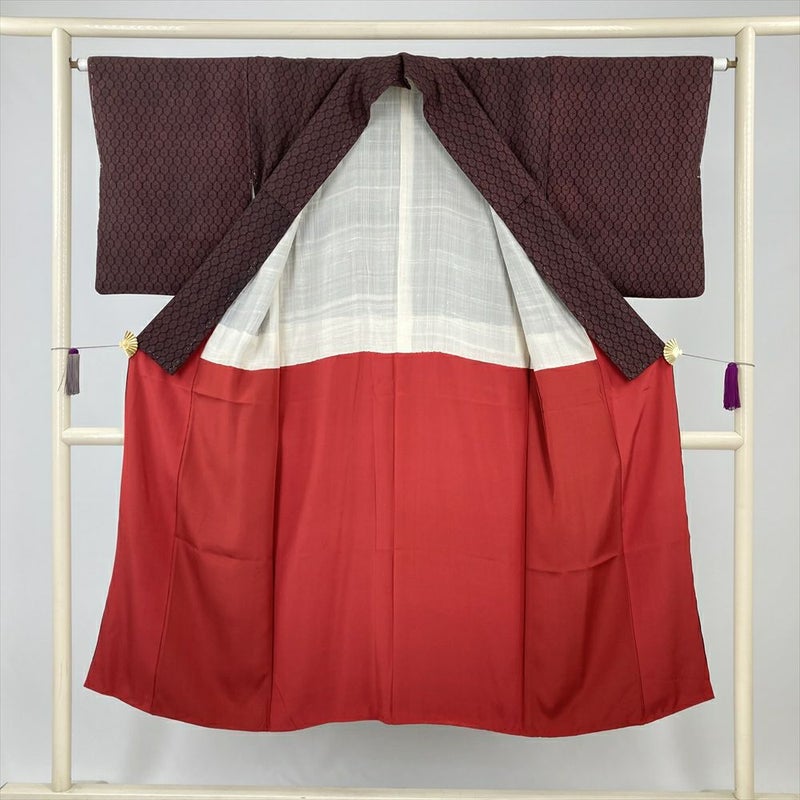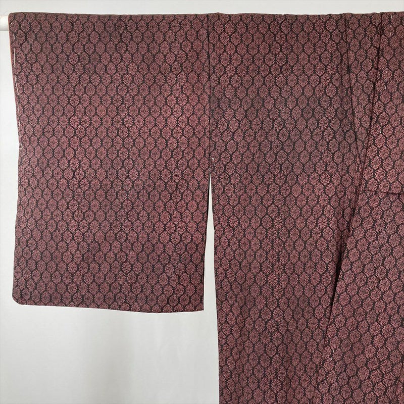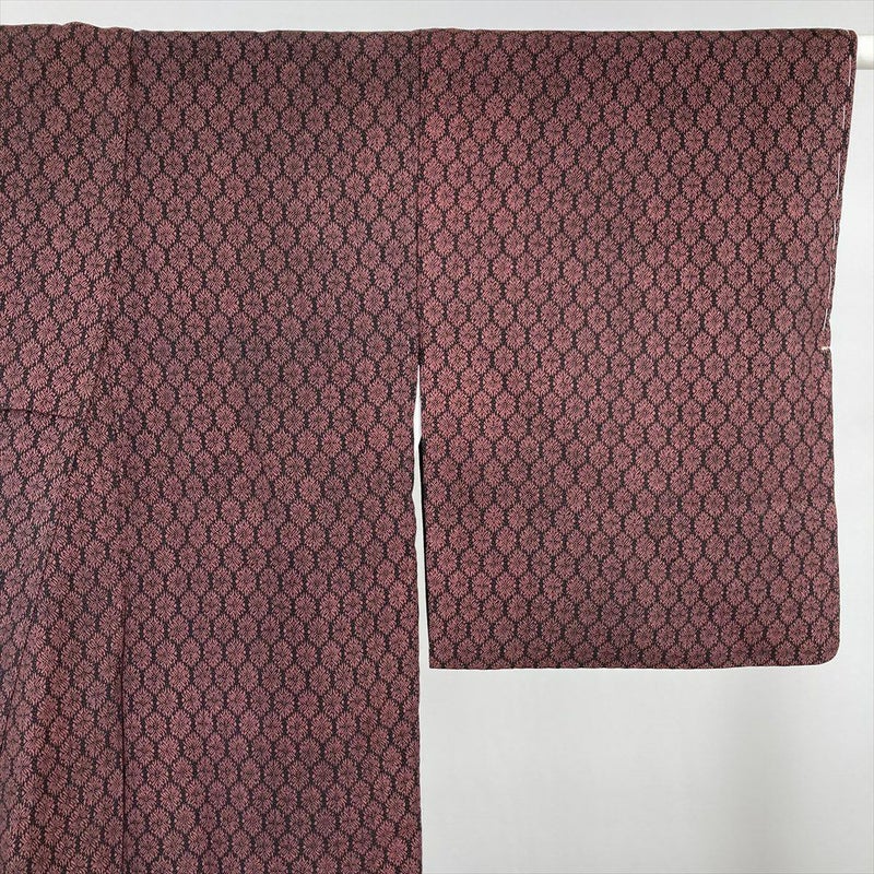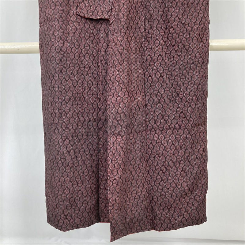 (中古) 紬 臙脂 赤 ヴィンテージ 幾何学 袷 絹【身丈】133.5cm【裄丈】64cm