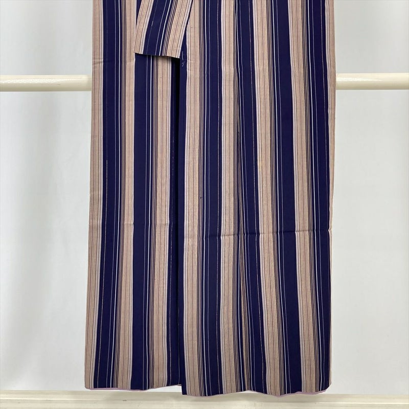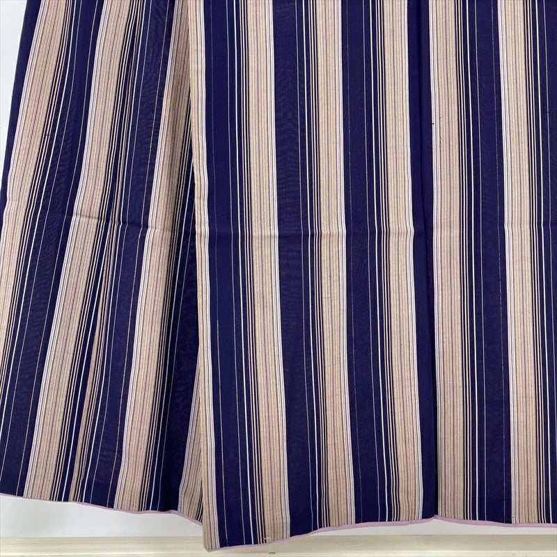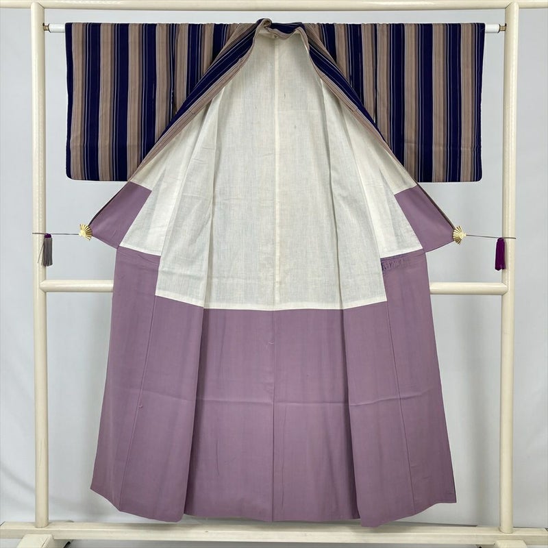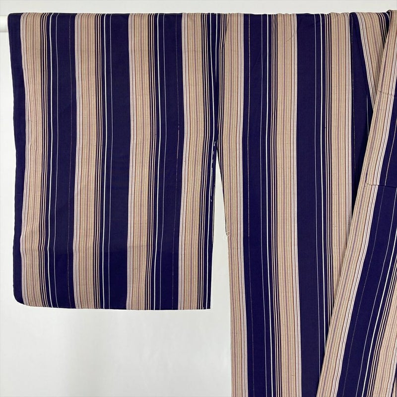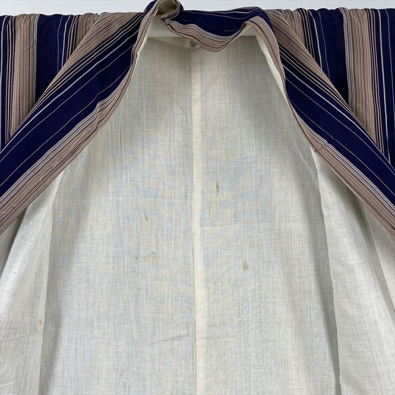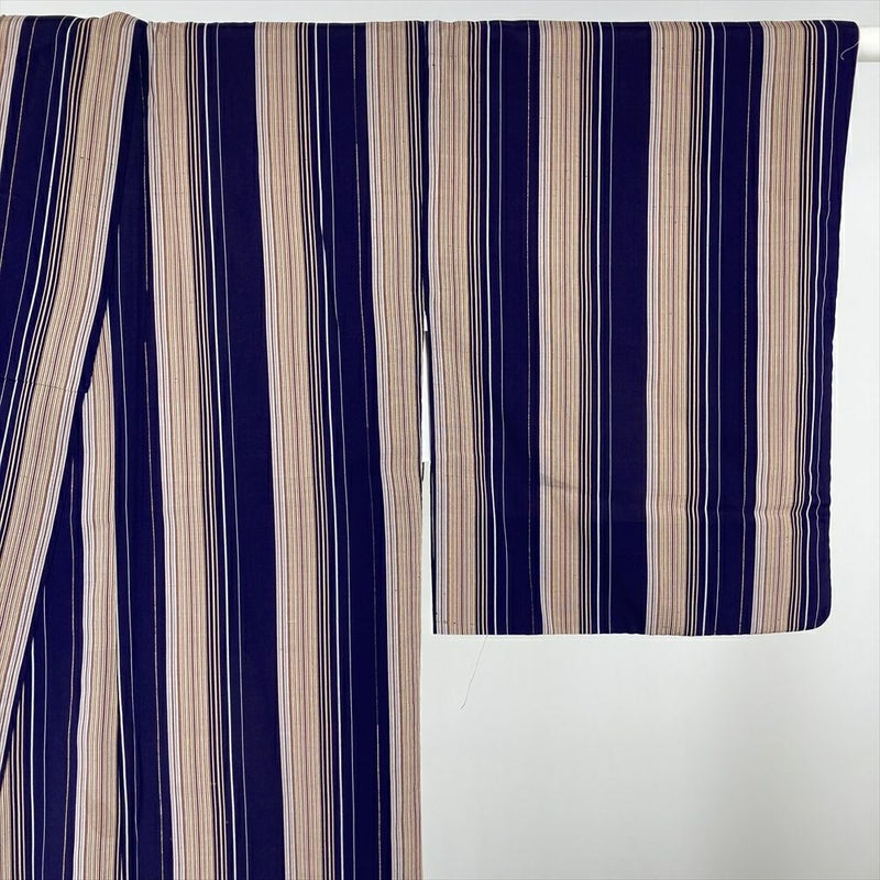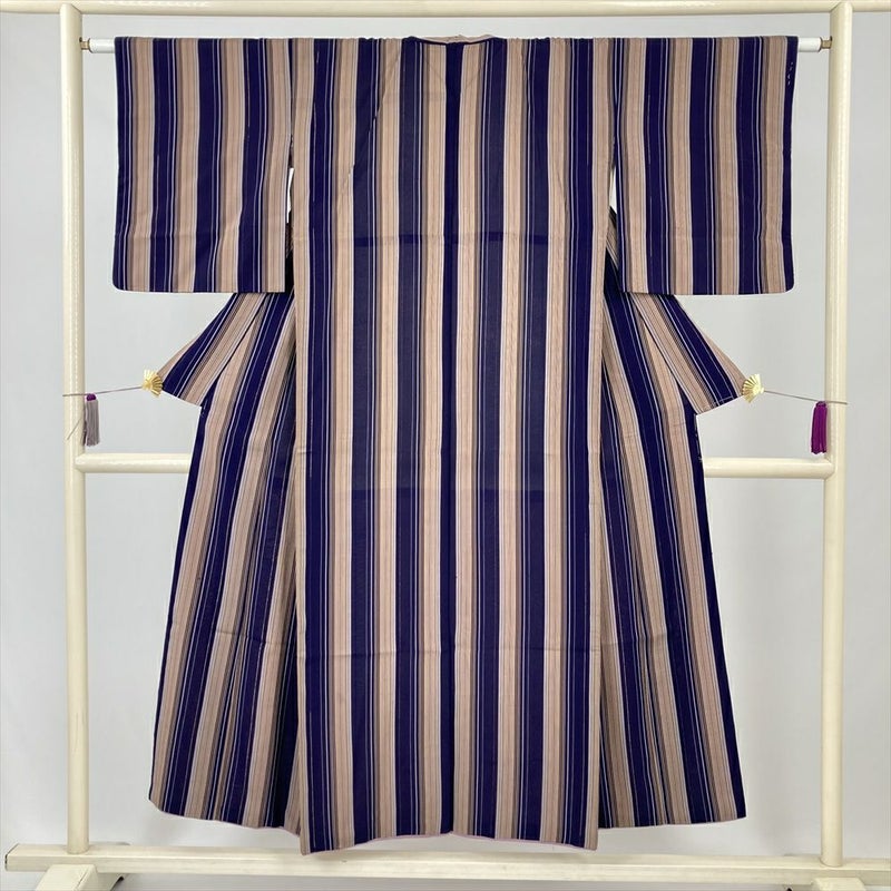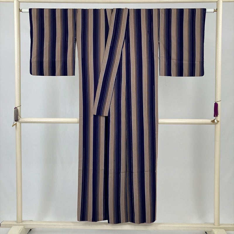 (中古) 紬 紺 ヴィンテージ 縞 袷 絹【身丈】143cm【裄丈】62.5cm