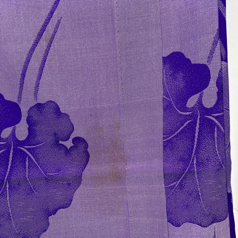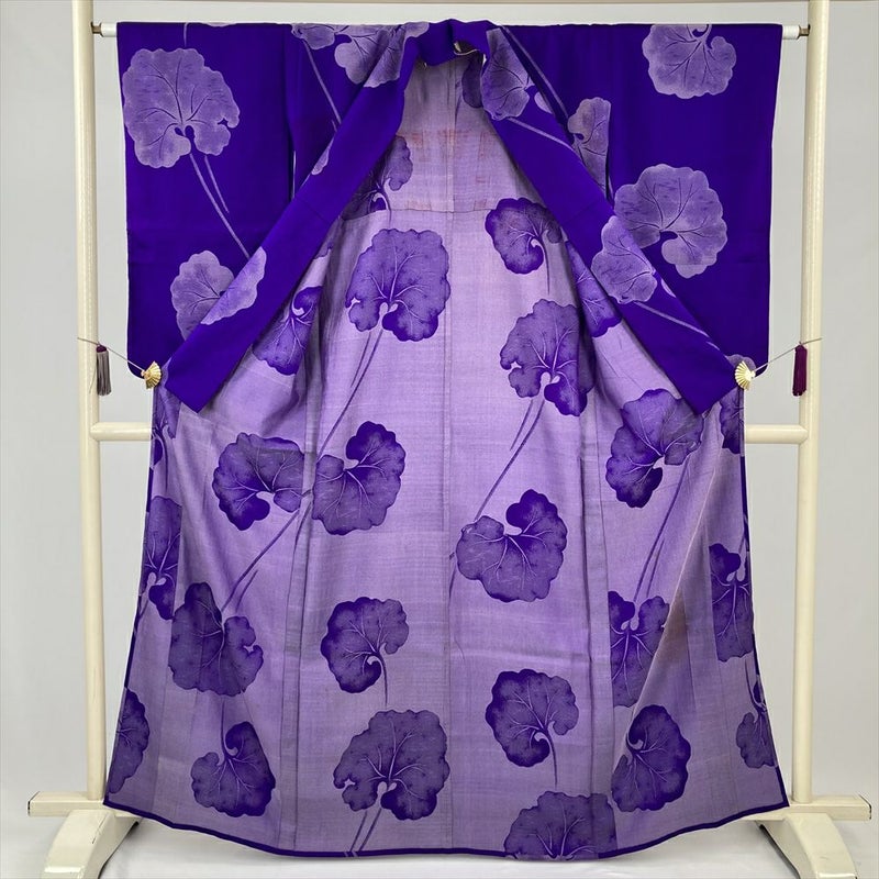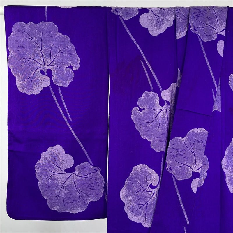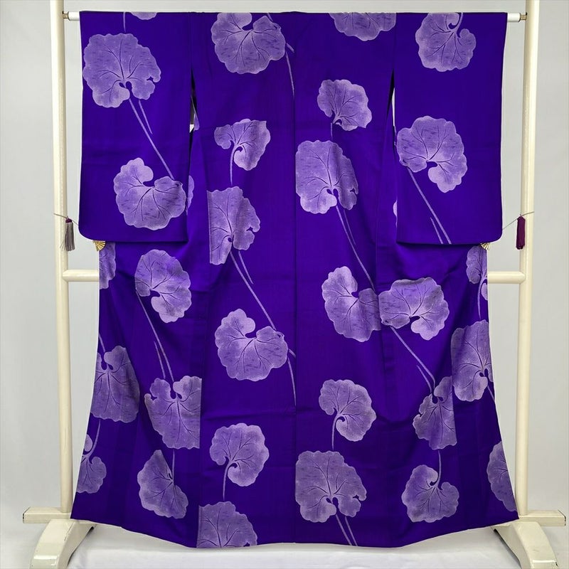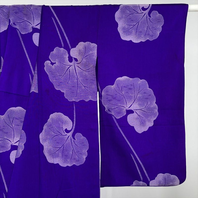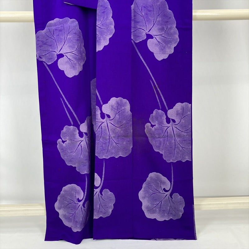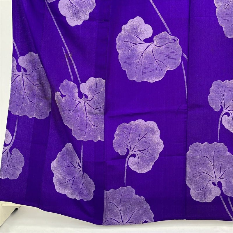 (中古) 紬 青紫 ヴィンテージ 蓮 単衣 絹【身丈】160cm【裄丈】63cm
