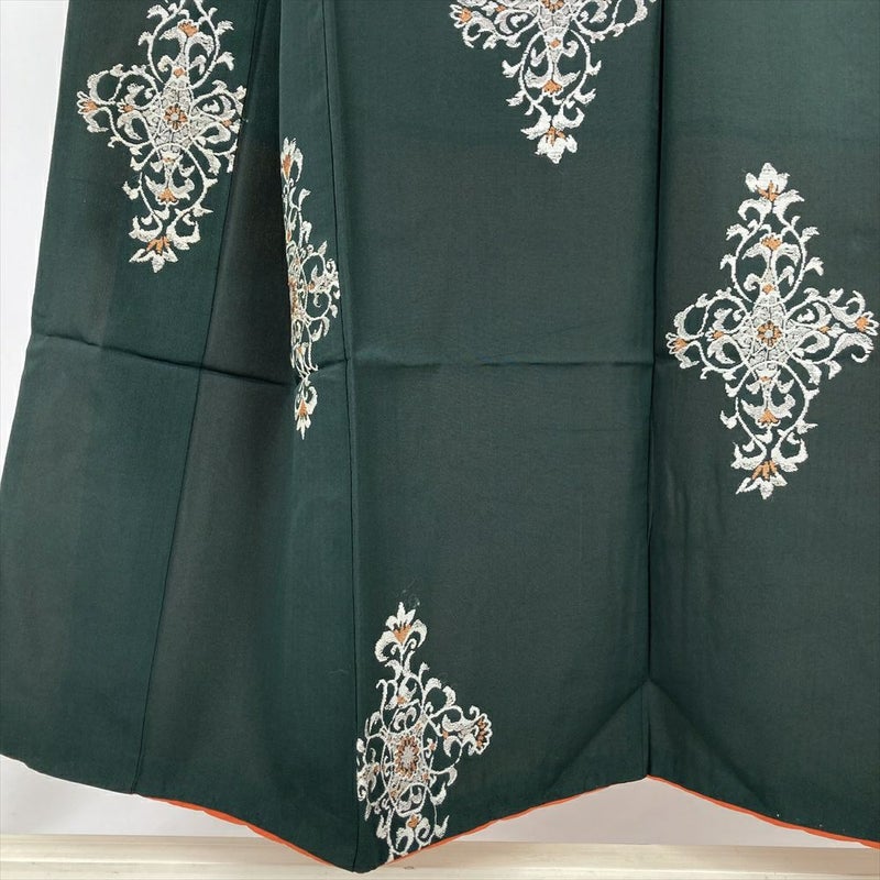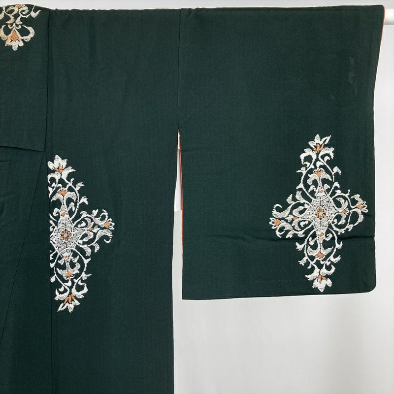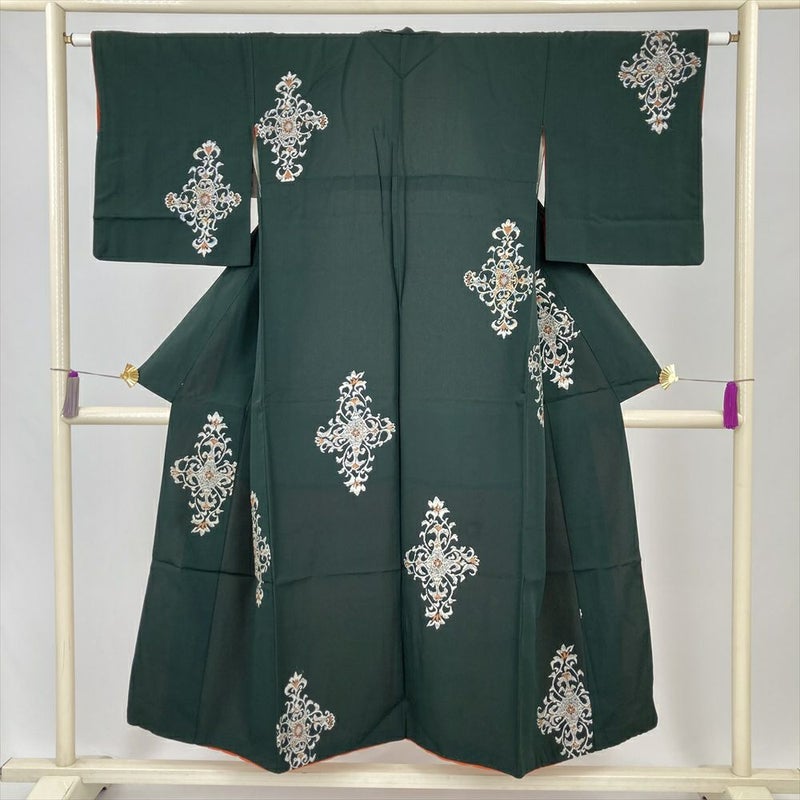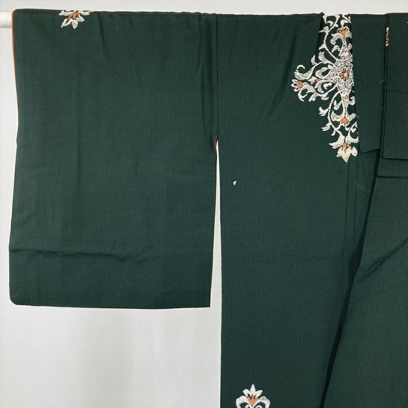 (中古) 紬 深緑 ヴィンテージ アールヌーボー 袷 絹【身丈】143.5cm【裄丈】62.5cm
