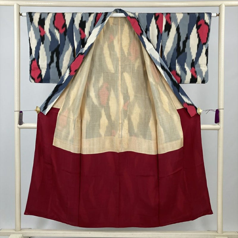 (中古) 紬 灰青 グレー ヴィンテージ 抽象柄 袷 絹【身丈】145cm【裄丈】63cm