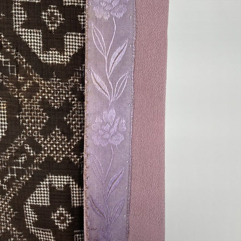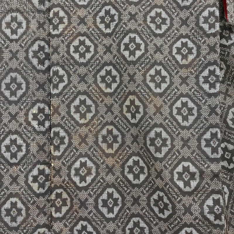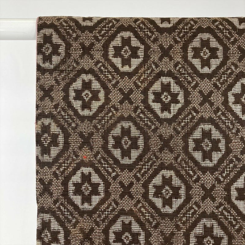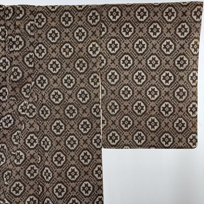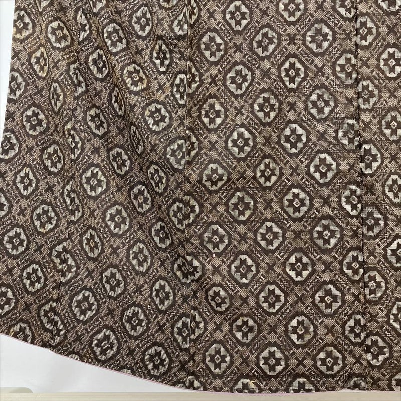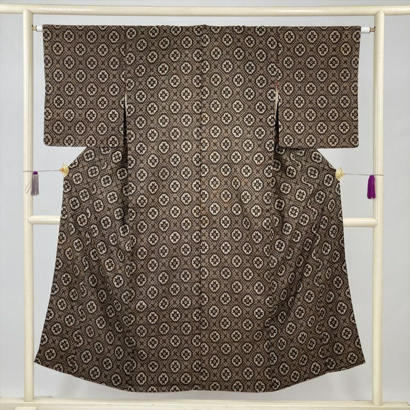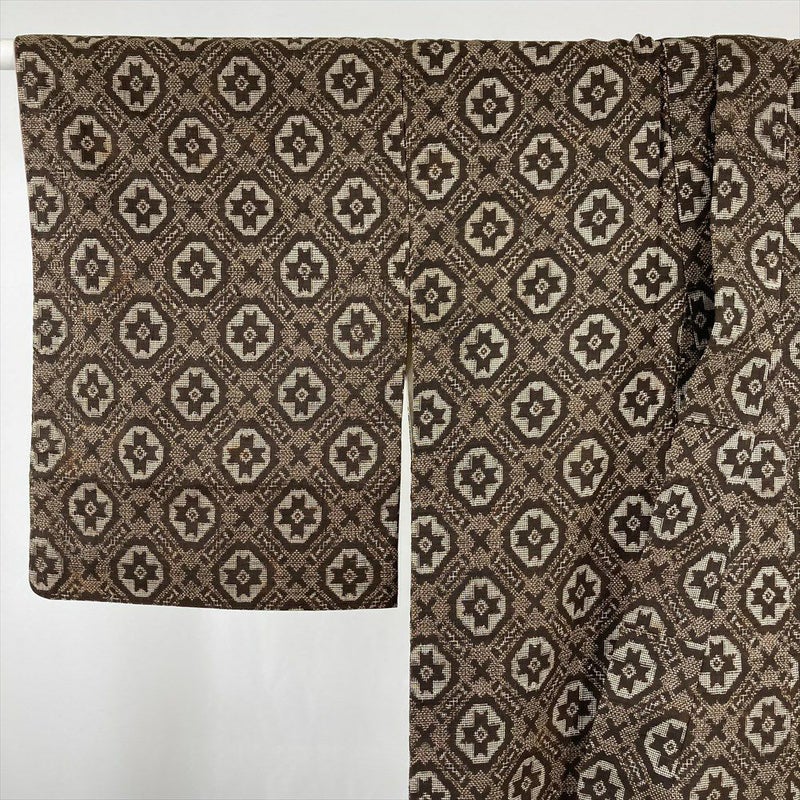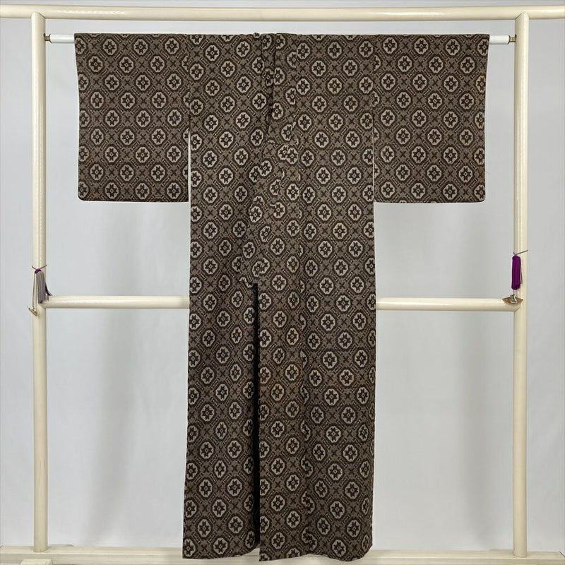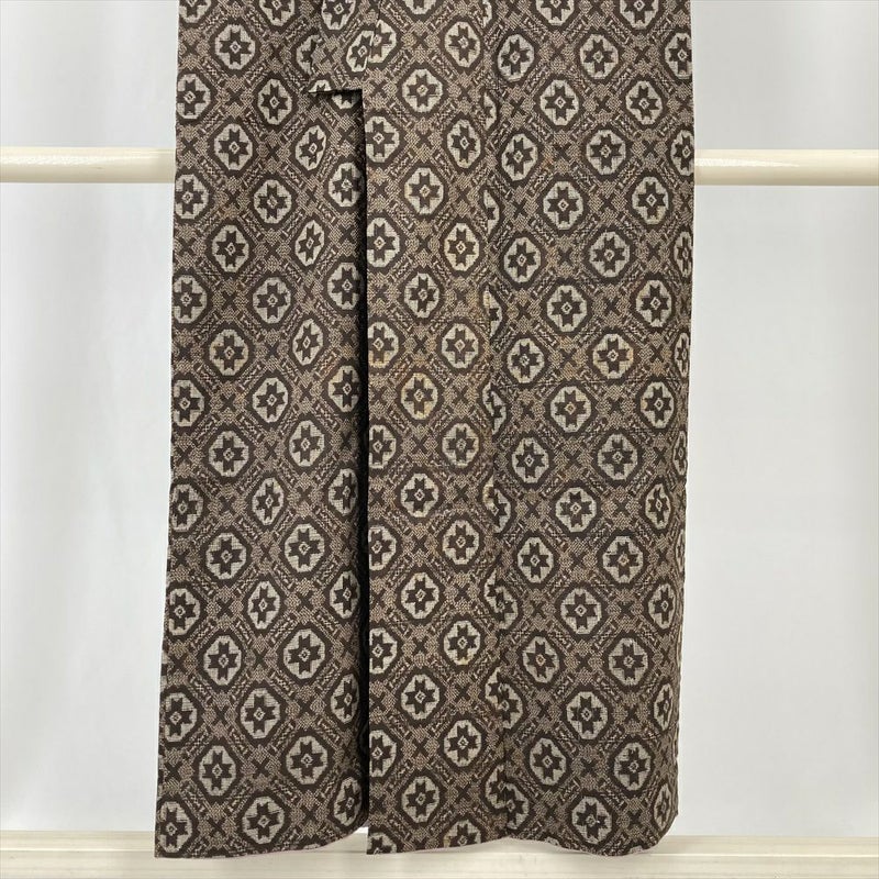(中古) 紬 茶 ヴィンテージ 幾何学柄 袷 絹【身丈】145.5cm【裄丈】63.5cm