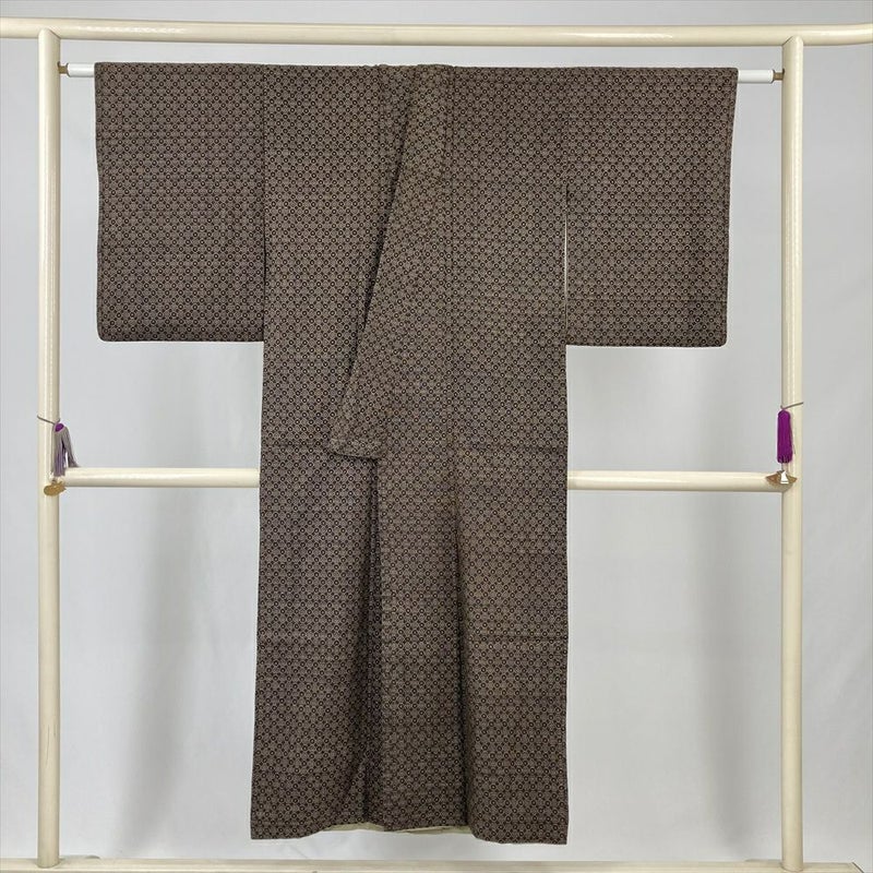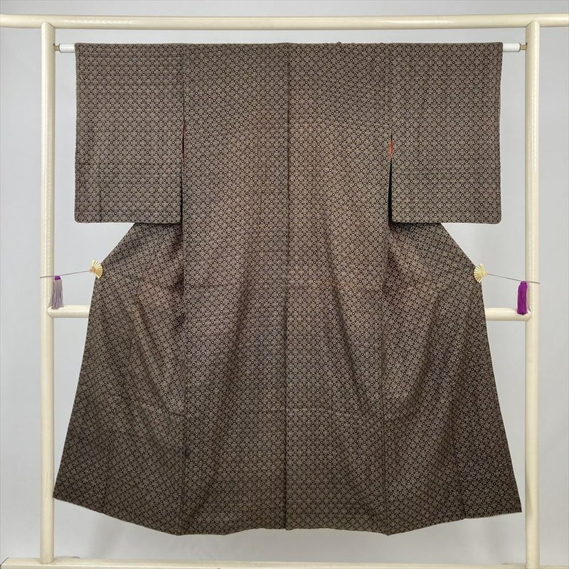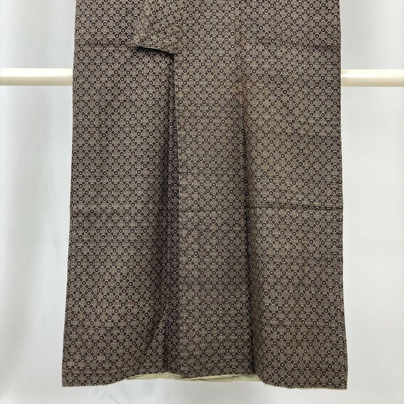 (中古) 紬 茶 ヴィンテージ 幾何学 袷 絹【身丈】139.5cm【裄丈】62cm