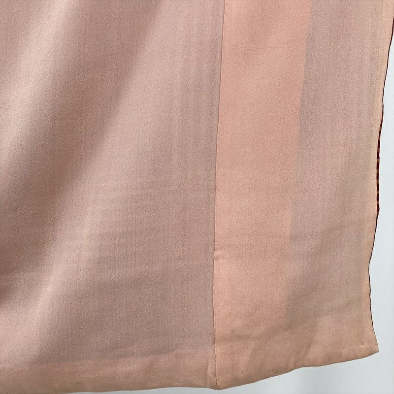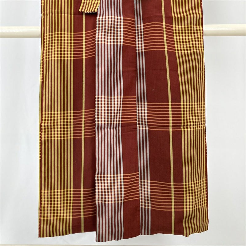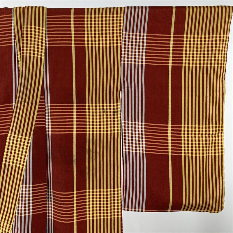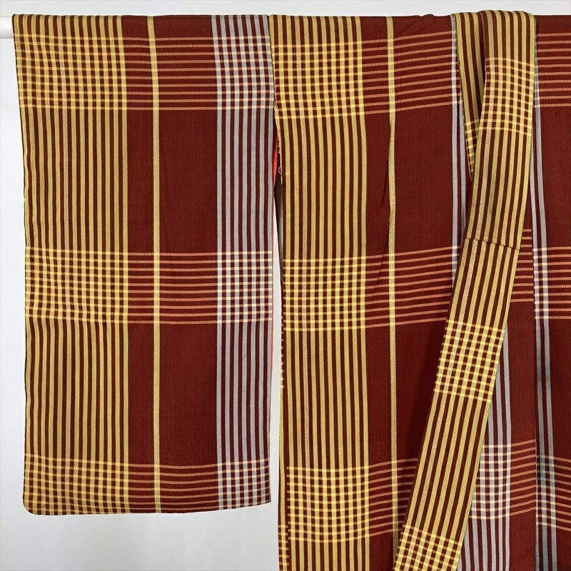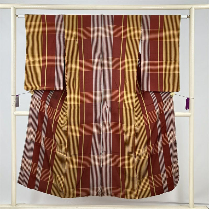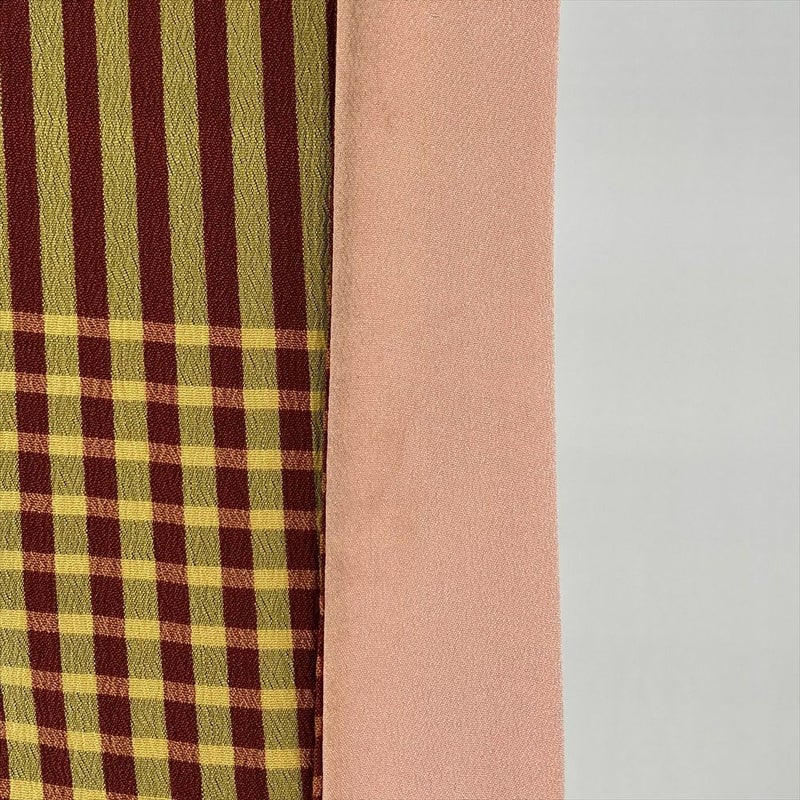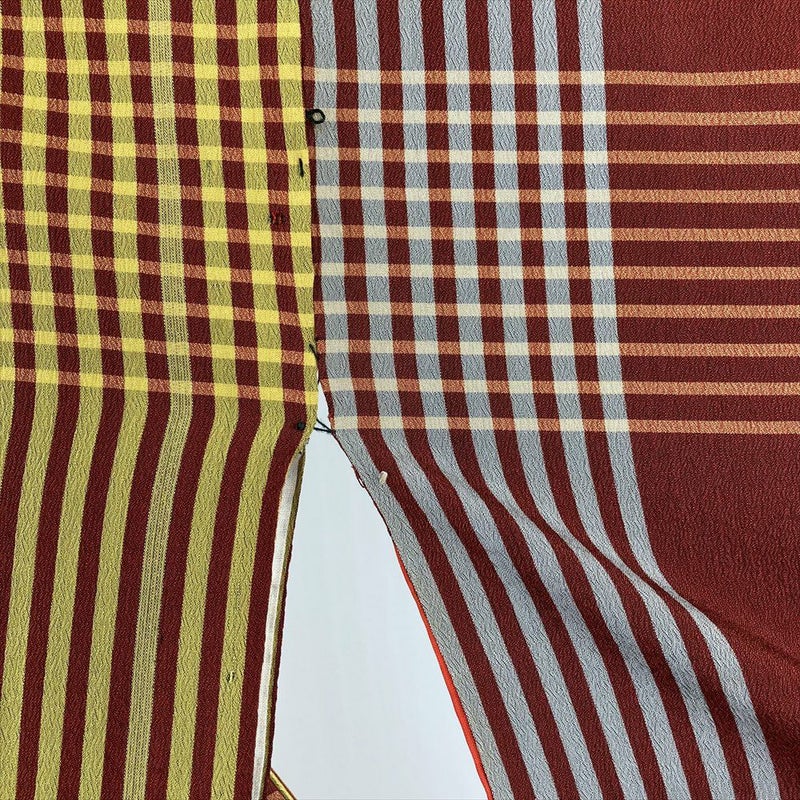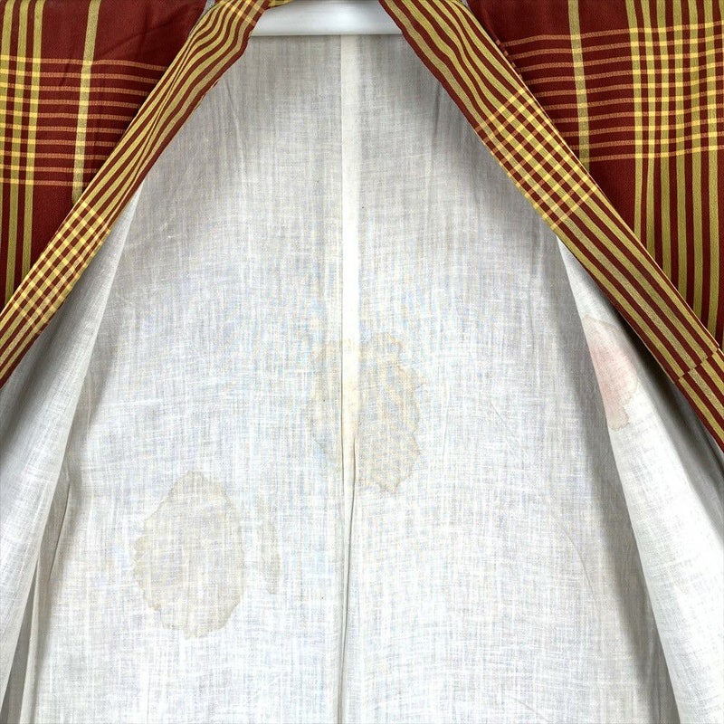 (中古) 紬 赤 黄 ヴィンテージ 格子 チェック 袷 絹【身丈】142cm【裄丈】60.5cm