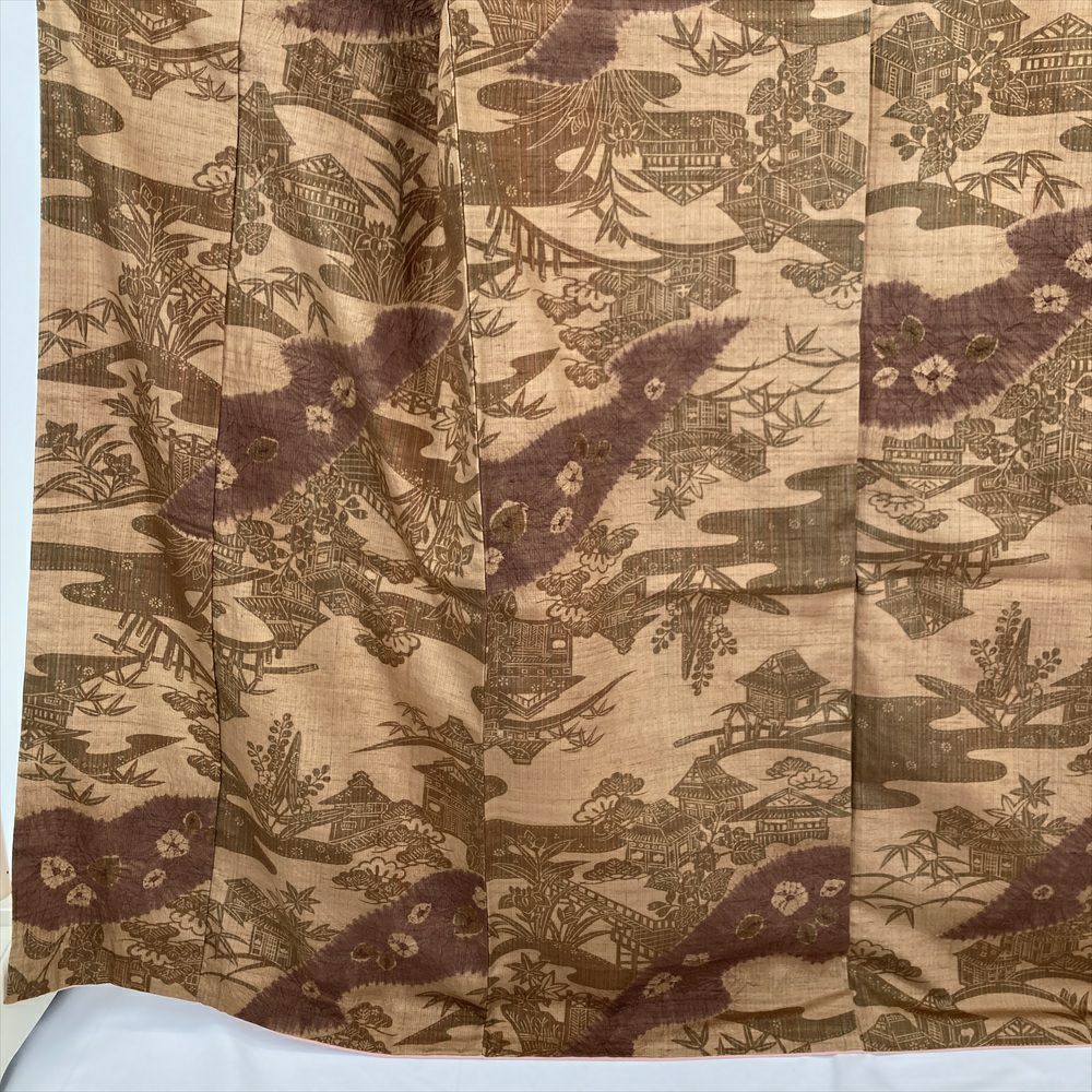 (中古) 紬 茶色 カジュアル 景色文 袷 絹【身丈】160cm【裄丈】65cm