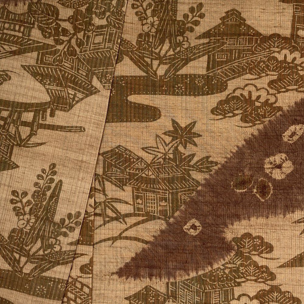 紬のざっくりとした風合いに、織りと絞りの技法で描かれた風景文が、見る人に奥深い趣を感じさせます。