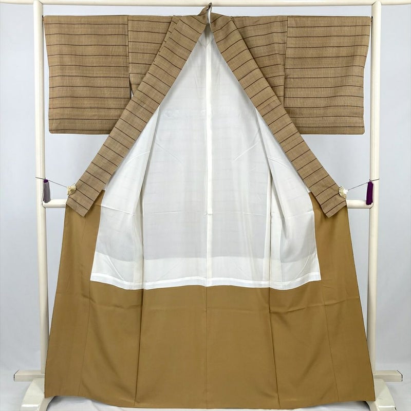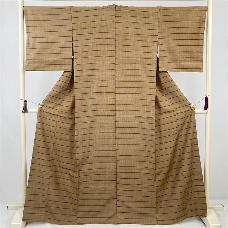落ち着いた金茶系の地色に、すっきりとしたシンプルな意匠が映えるきもの。
