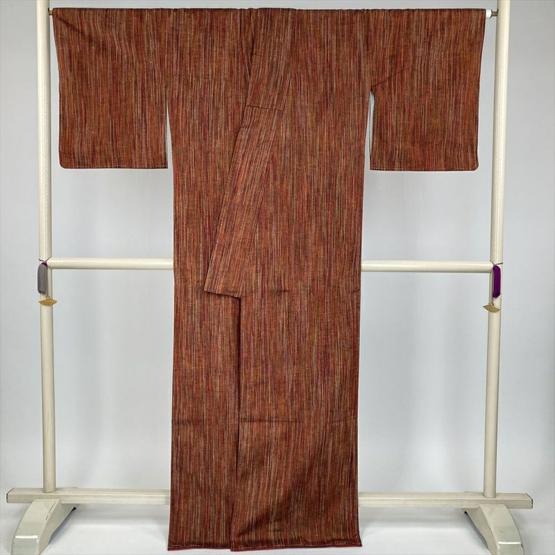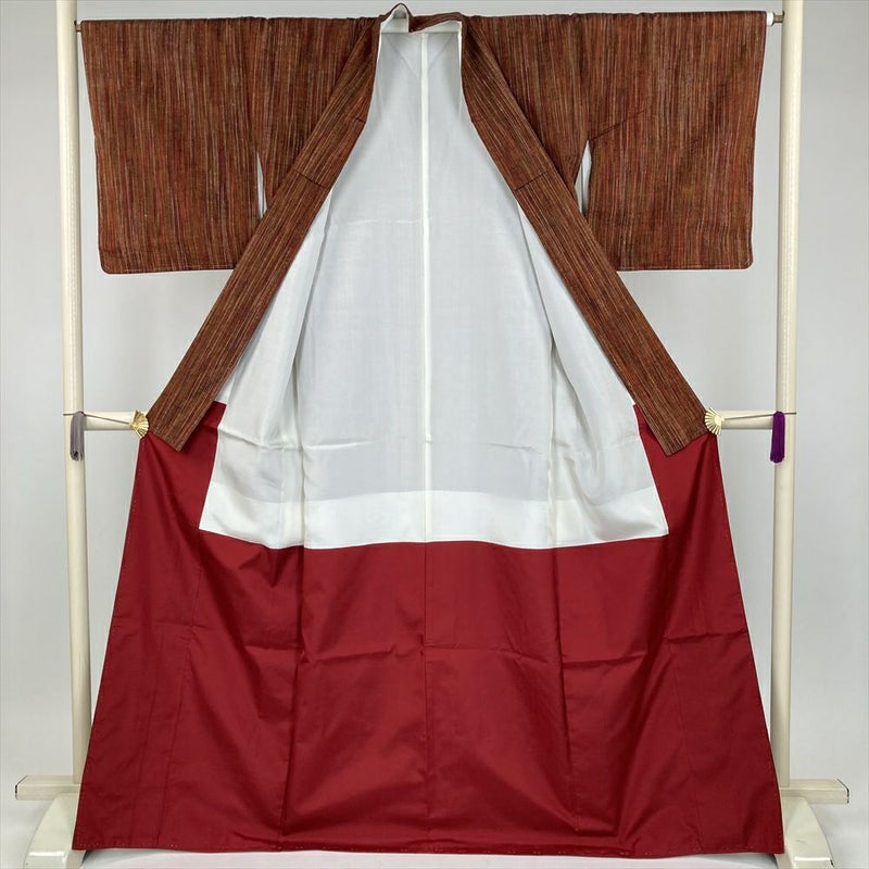 (中古) 紬 赤茶 カジュアル 縞 袷 絹【身丈】163cm【裄丈】66.5cm