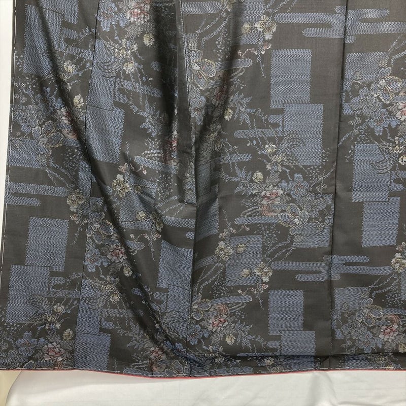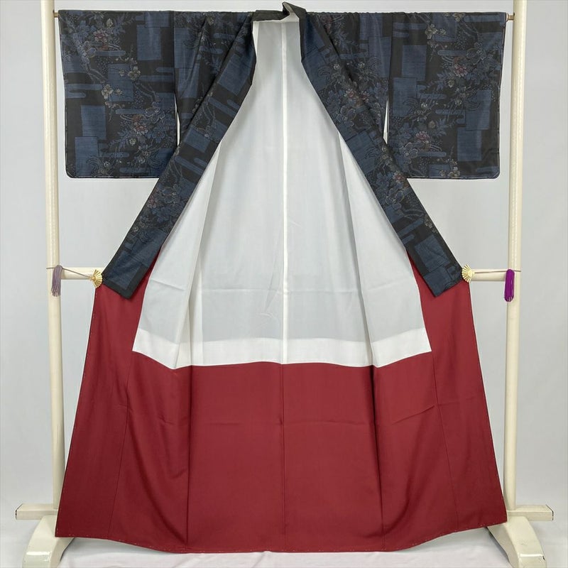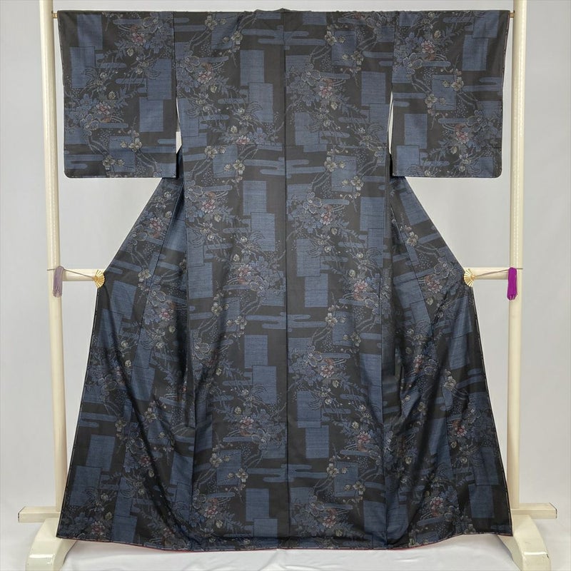 (中古) 大島紬 黒 紺 カジュアル 横双 エ霞 四季花 袷 絹 【身丈】160.5cm【裄丈】67cm
