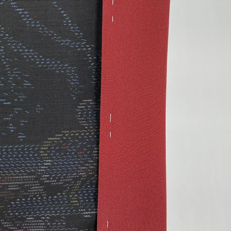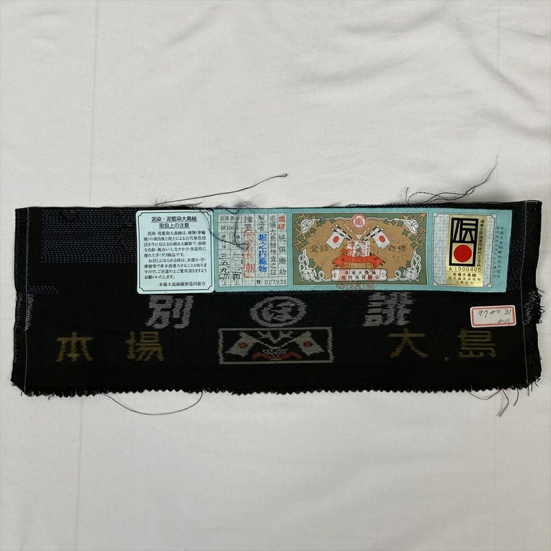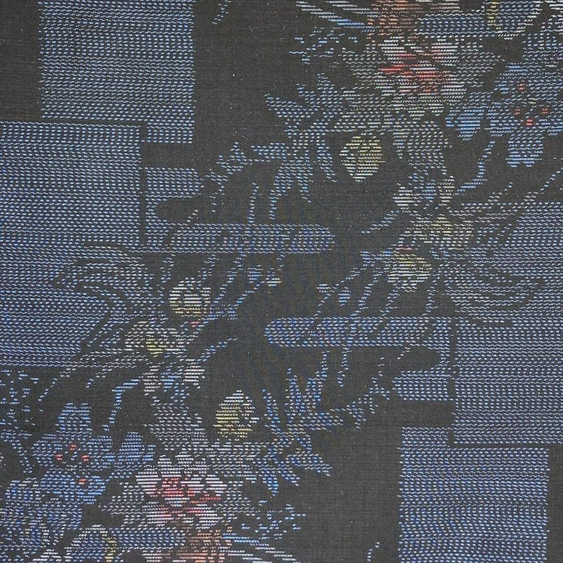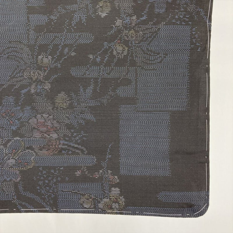 黒に紺が溶け合う深みのある地色に、横双織りで表現されたエ霞と四季の花々が静かに浮かぶ大島紬。