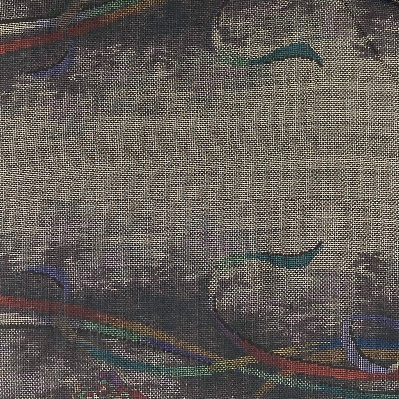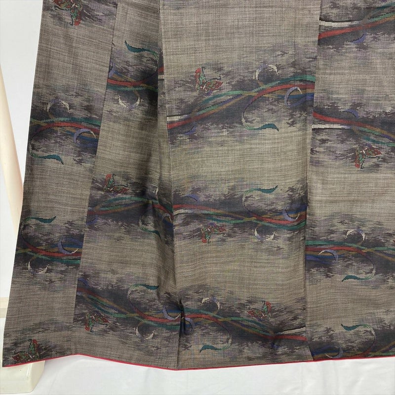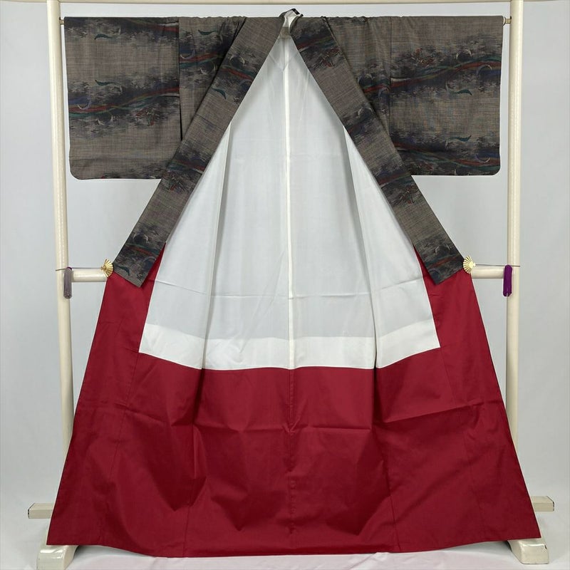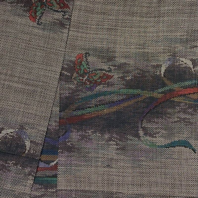 独特の艶と軽さが魅力の大島紬。落ち着いた焦げ茶色の地に、モダンなデザインの蝶の柄が織り出されています。その精緻な織りは、見るたびにうっとりするほど。手に取るとその軽さに驚き、しなやかな風合いは着るほどに体に馴染みます。目立つダメージもなく、中古とは思えないほど綺麗な状態でお届けできます。