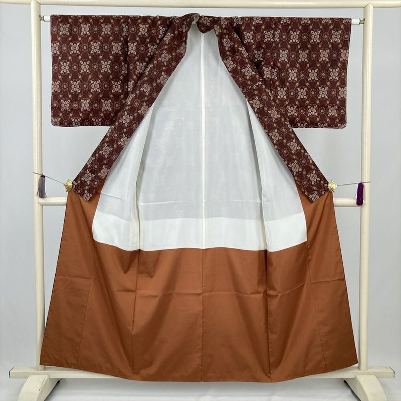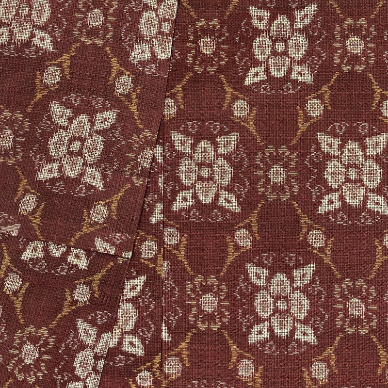 独特の艶と軽さが魅力の大島紬。赤茶色の地に、繊細な花のパターン柄が織り出された、どこか憂いを帯びたような落ち着きのある逸品です。手に取った時に感じる、とろんとした滑らかな風合いと、着崩れしにくいハリ感は、着物通も納得のクオリティです。目立つダメージもなく、中古とは思えないほど綺麗な状態です。
