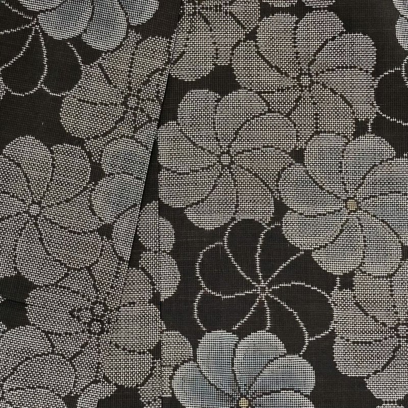 シックな地色と花文様の組み合わせが絶妙で、着姿に奥行きと上品な華やかさを与えます。