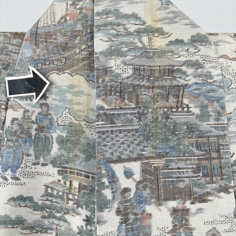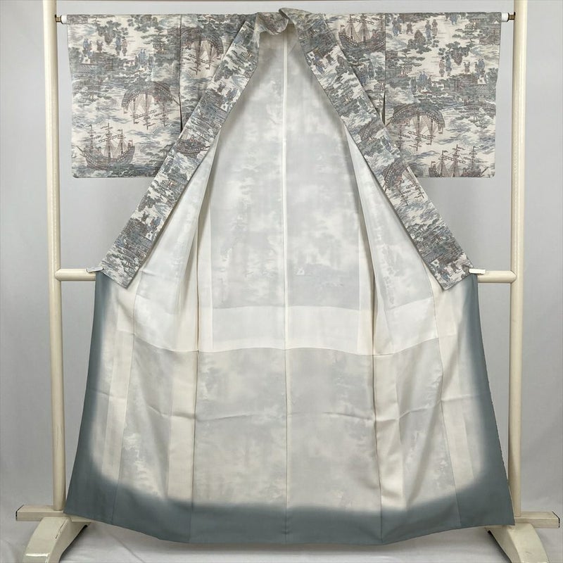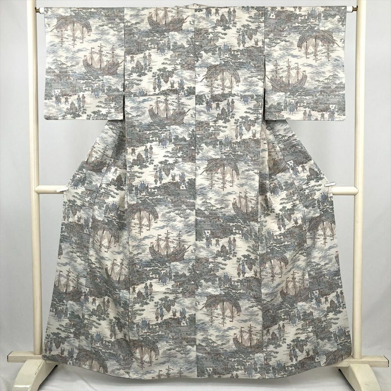 (中古) 紬 白 カジュアル 南蛮船 港 人物文 袷 絹 【身丈】156.5cm【裄丈】63.5cm