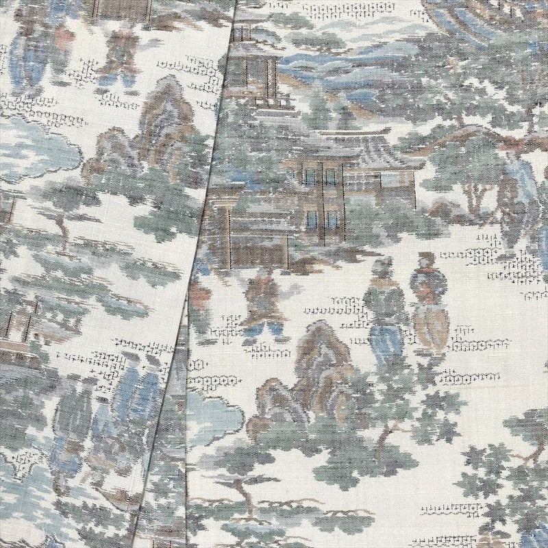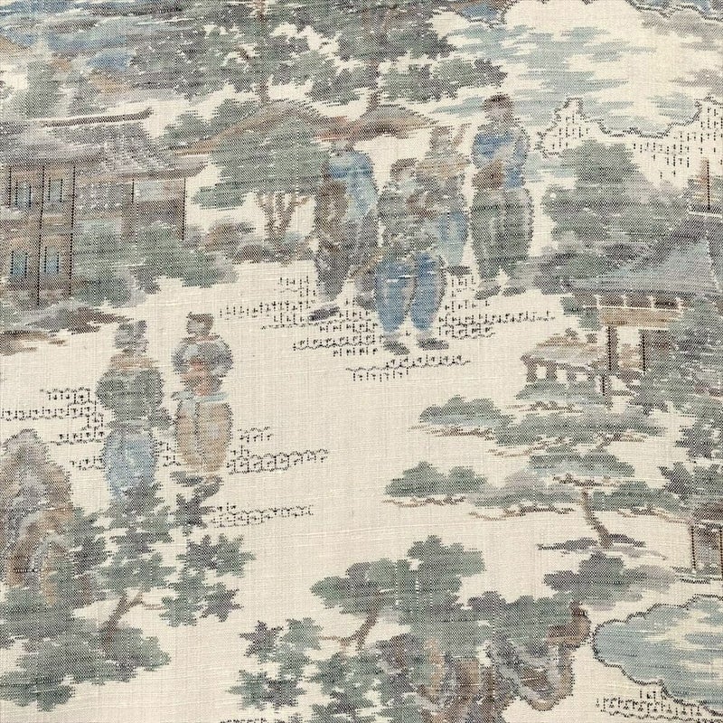 遠景には行き交う人々が描かれ、当時の賑わいを感じさせる、大変**物語性豊かな文様**。