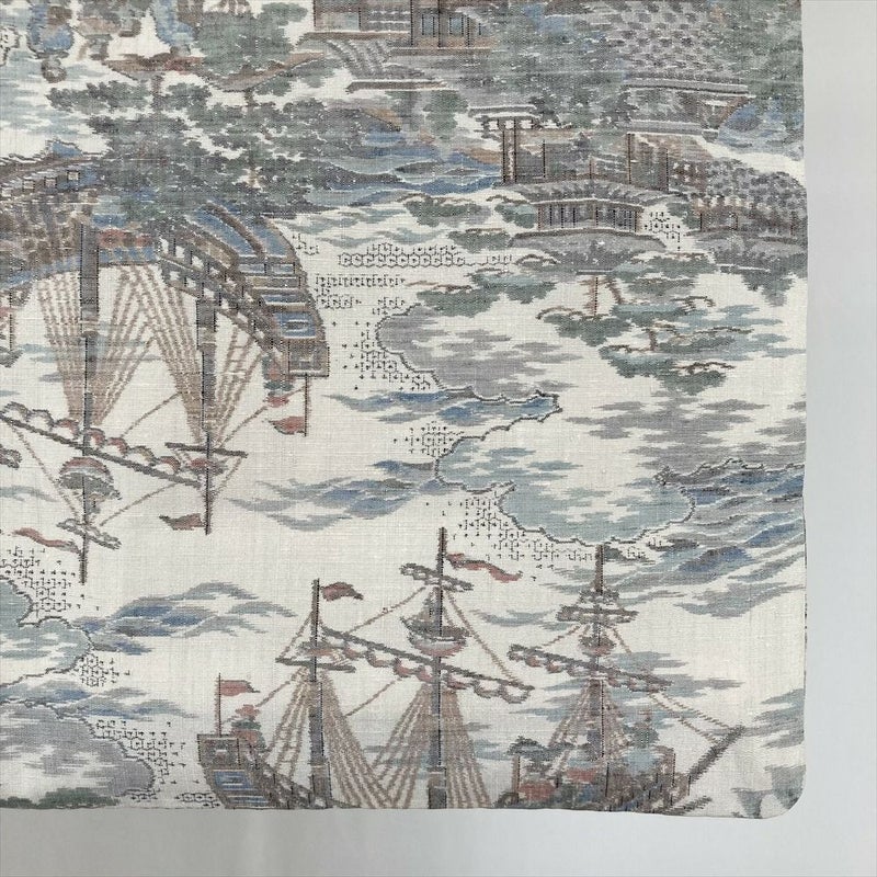 素朴な紬(つむぎ)の地に、異国情緒あふれる**南蛮船と港の情景**を総柄で織り上げた、趣深い一枚です。