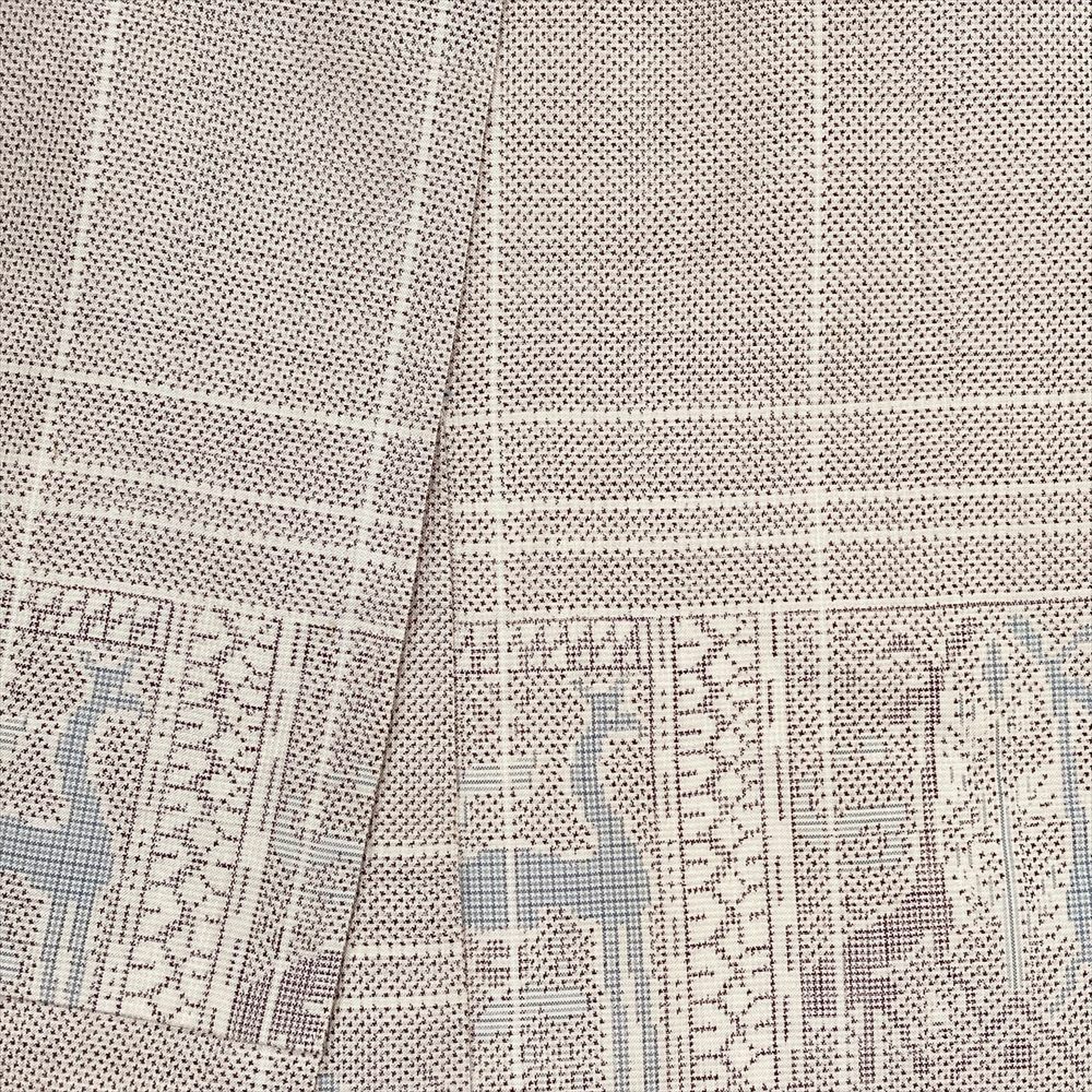薄白茶に臙脂を効かせた変わり格子に、愛らしい動物文を織り込んだ大島紬。
