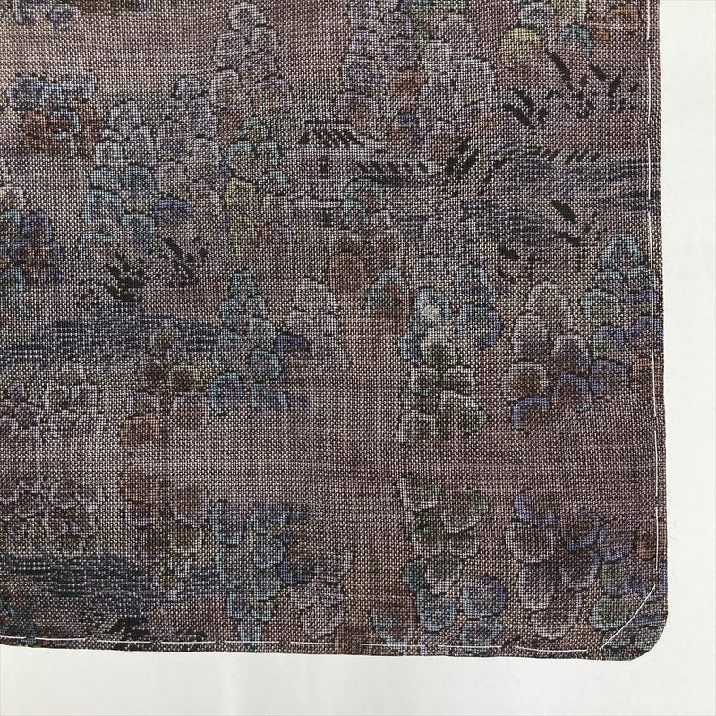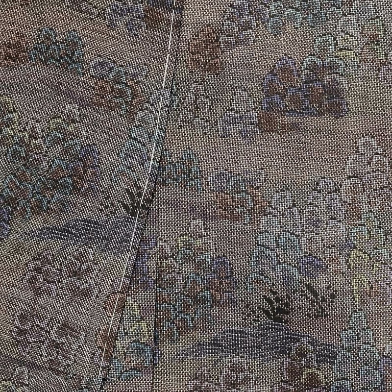 <div class=焦げ茶の地に精緻な絣で風景文を織り込んだ本場大島紬。