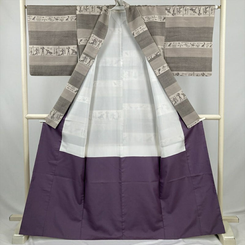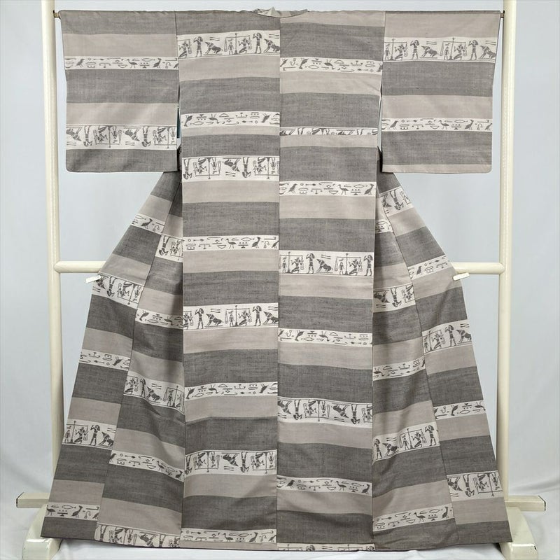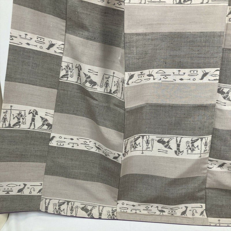 (中古) 紬 グレージュ 灰茶 カジュアル 横段 古代 エジプト ヒエログリフ 袷 絹 【身丈】161.5cm【裄丈】66cm