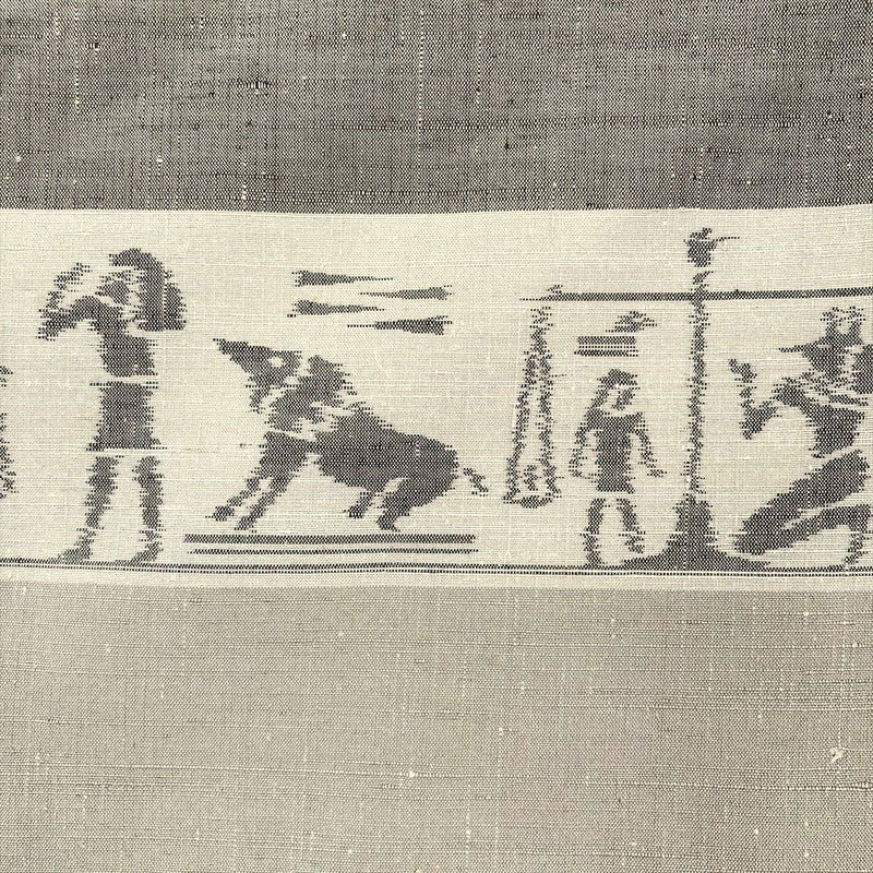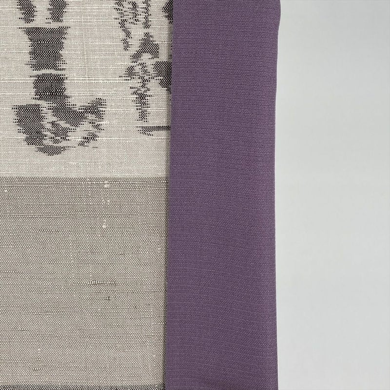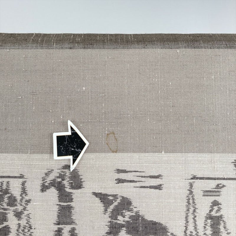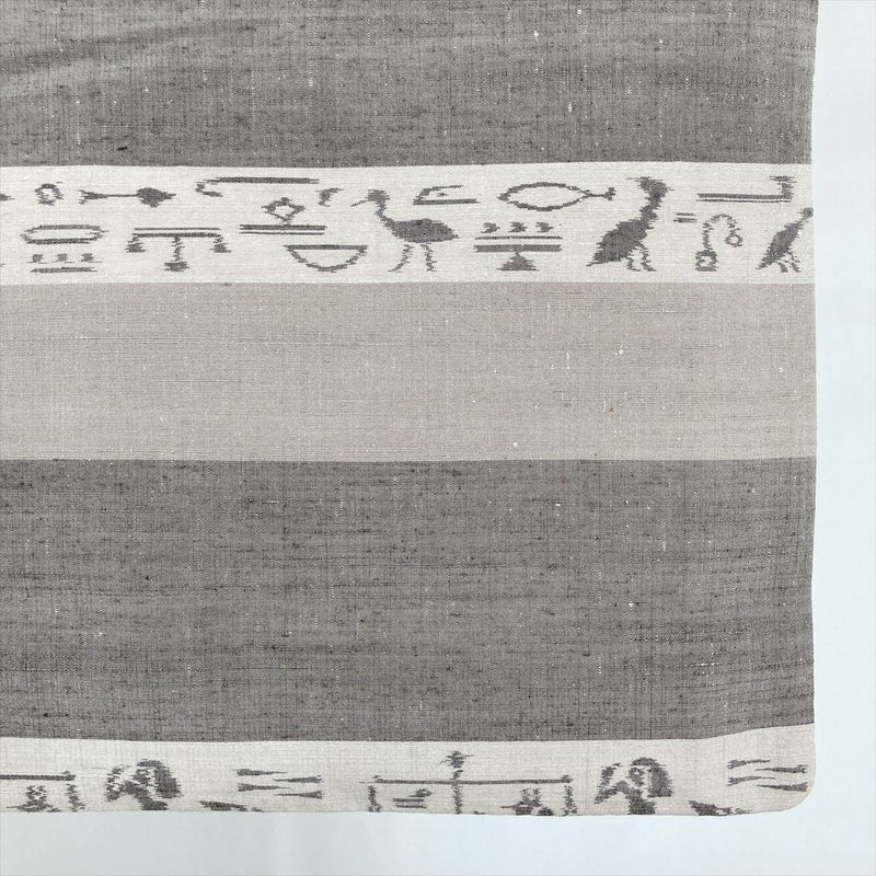 <div class=グレージュと灰茶の地に、古代エジプトのヒエログリフを思わせる横段柄を織り込んだ紬。