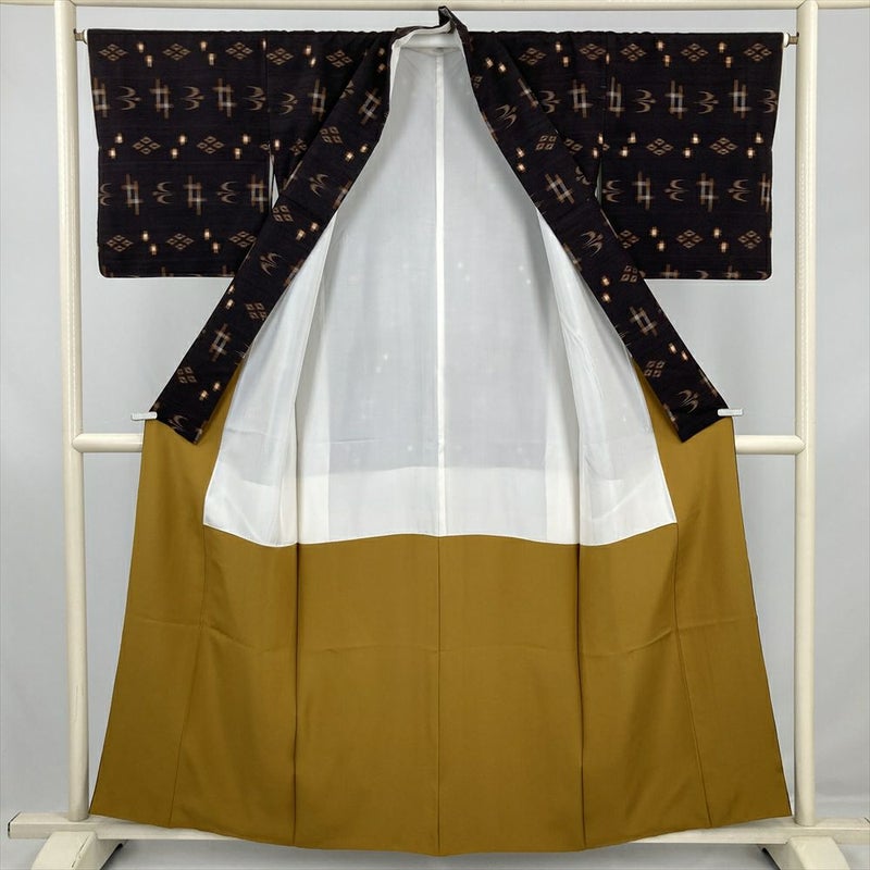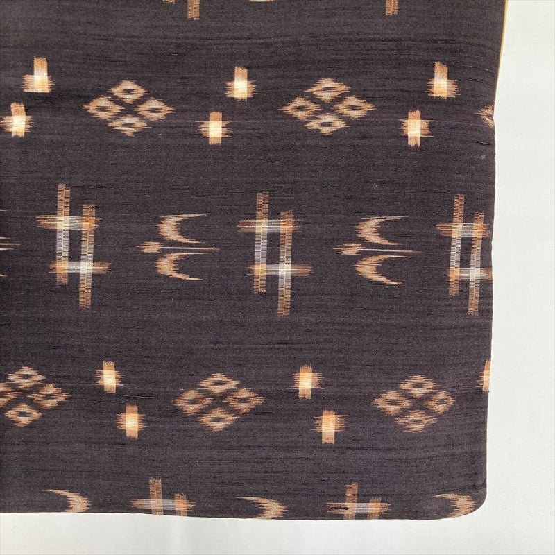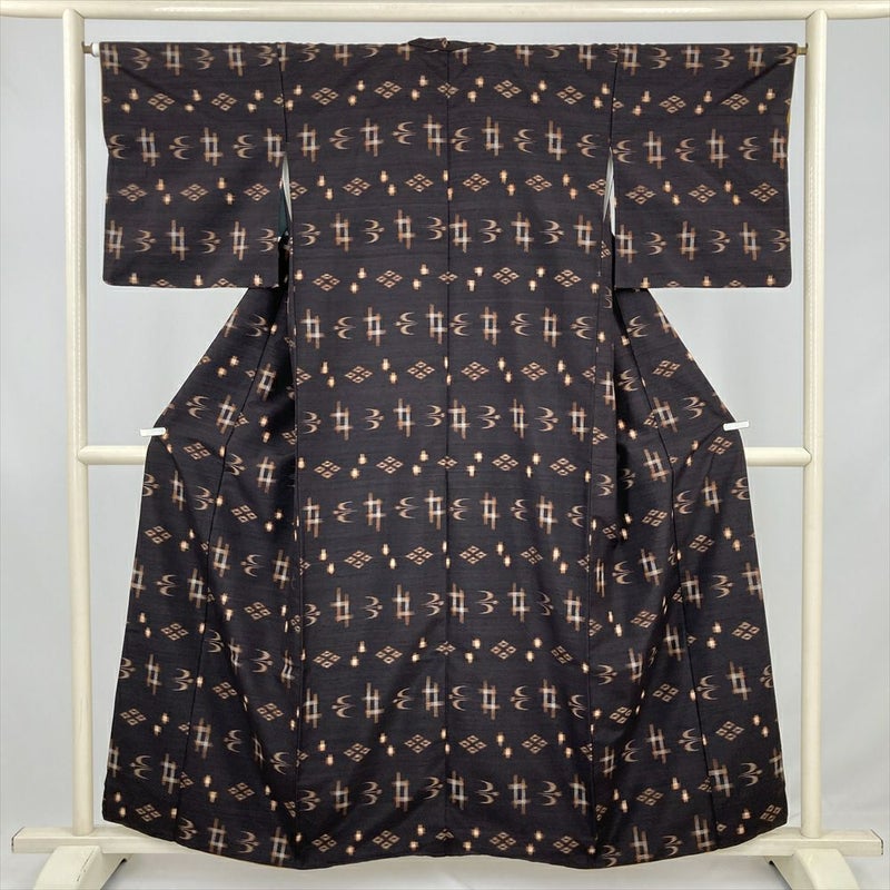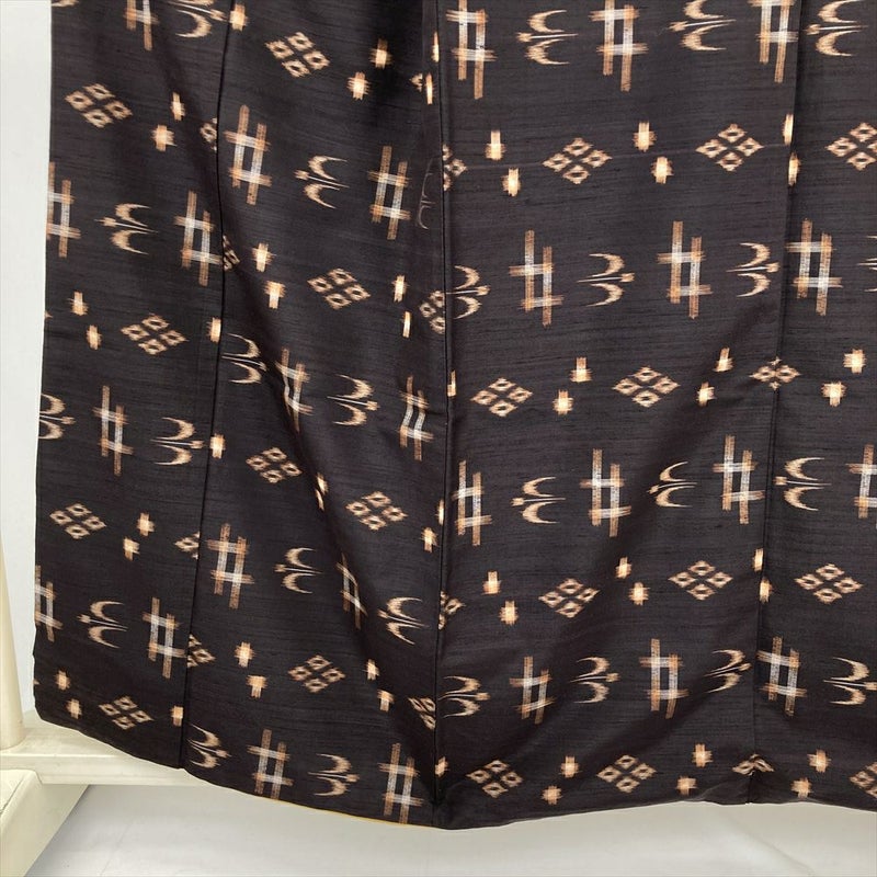 (中古) 久米島紬 焦げ茶 カジュアル 絣 小鳥 井桁 袷 絹 【身丈】151cm【裄丈】65.5cm