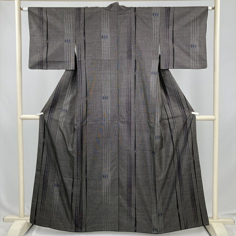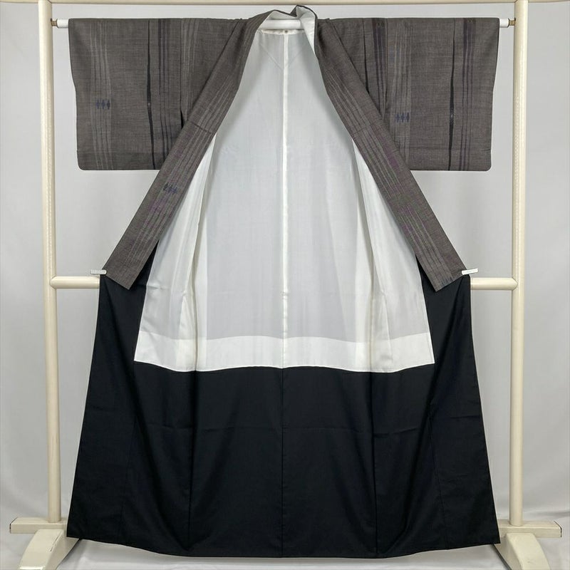 (中古) 大島紬 焦げ茶 カジュアル 変わり縞 菱文 袷 絹【身丈】155cm【裄丈】63cm