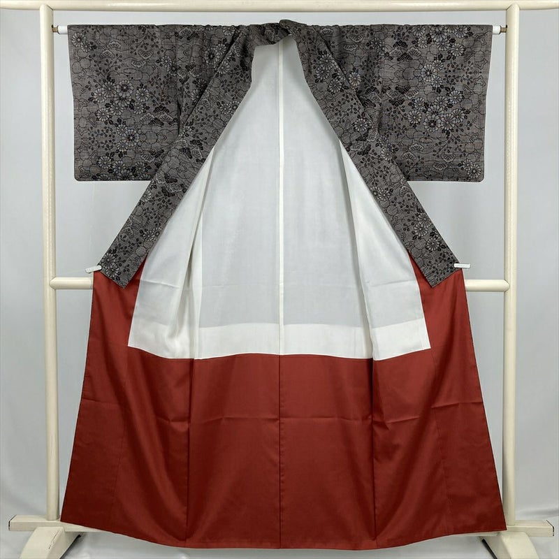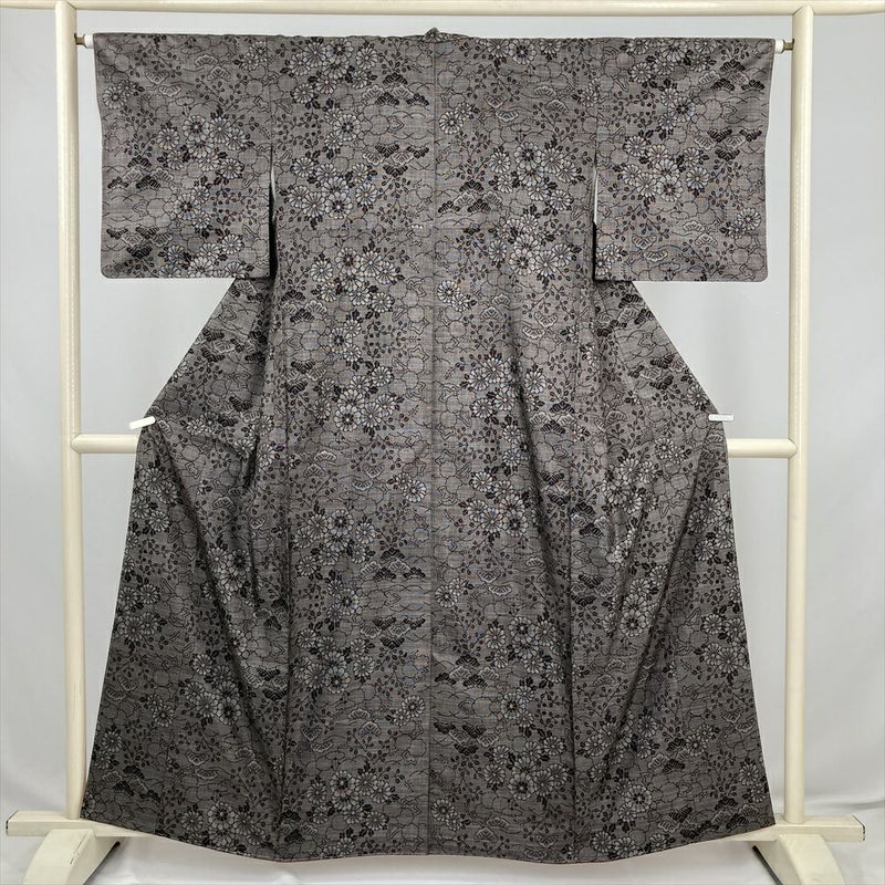 (中古) 大島紬 焦げ茶 カジュアル 菊 松 萩 袷 絹 【身丈】154.5cm【裄丈】64.5cm