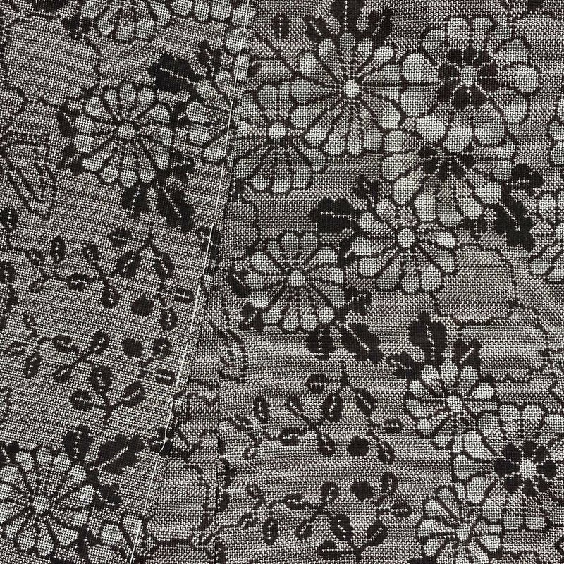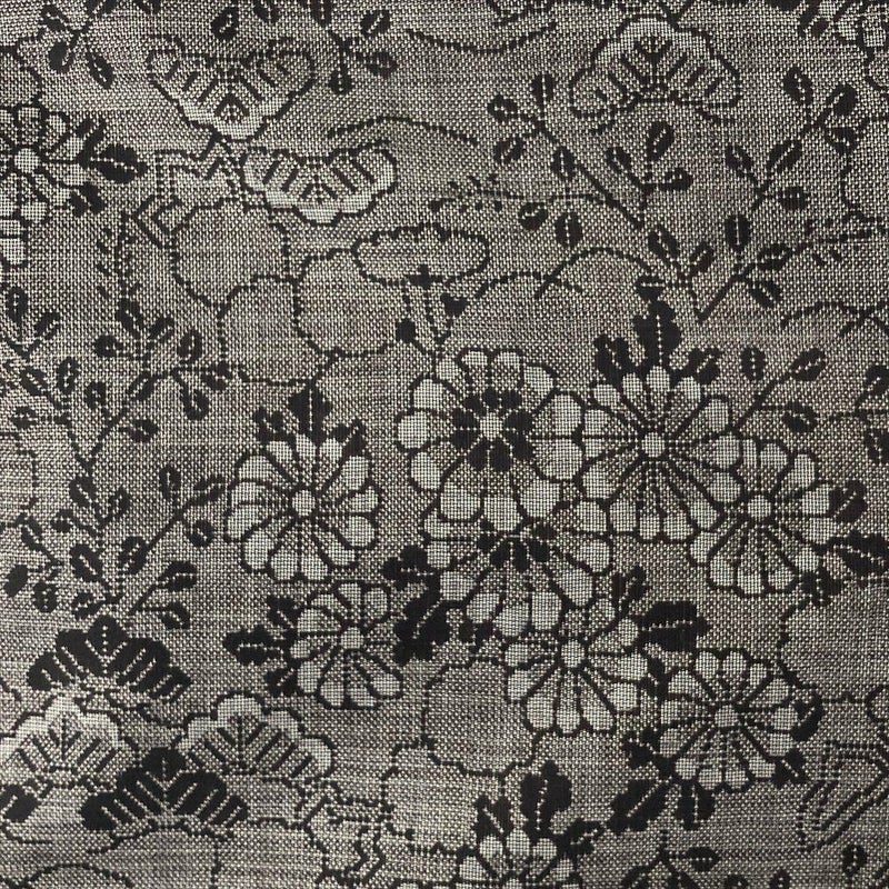 焦げ茶の地に菊・松・萩を精緻な絣で表現した大島紬。