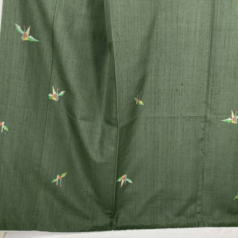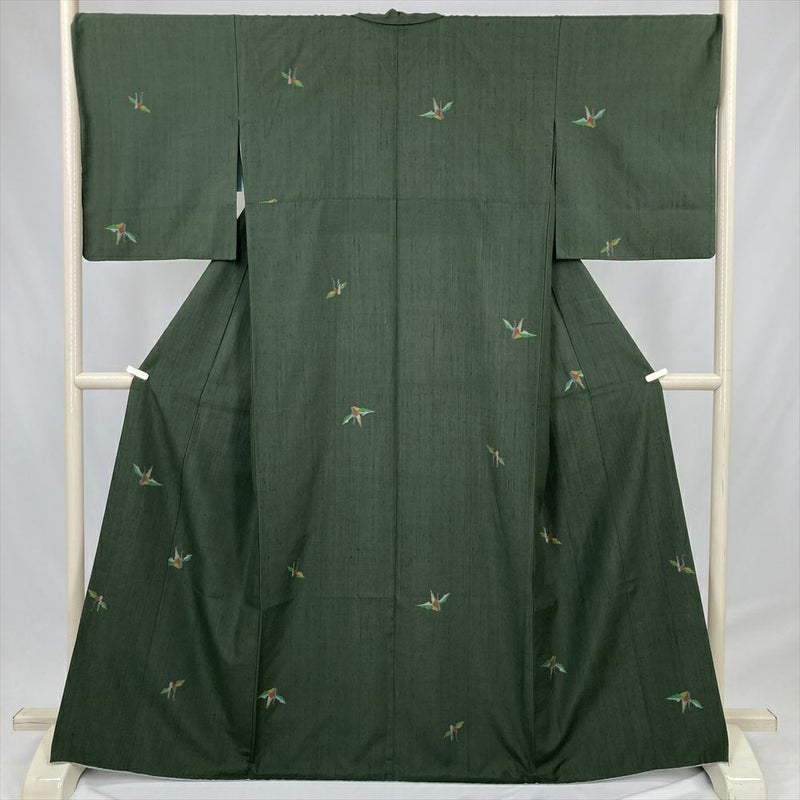 (中古) 紬 濃緑 カジュアル 折り鶴 袷 絹【身丈】160.5cm【裄丈】69.5cm