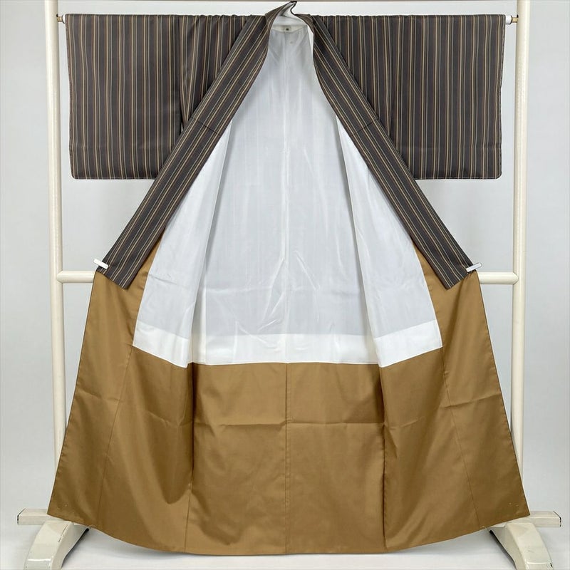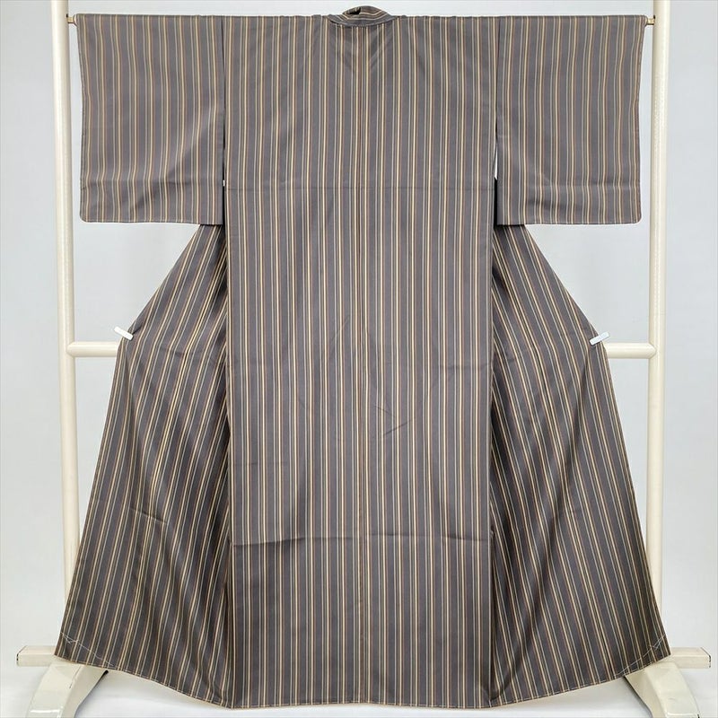 (中古) 紬 チャコールグレー 茶 カジュアル 縞 袷 絹 【身丈】156cm【裄丈】66cm