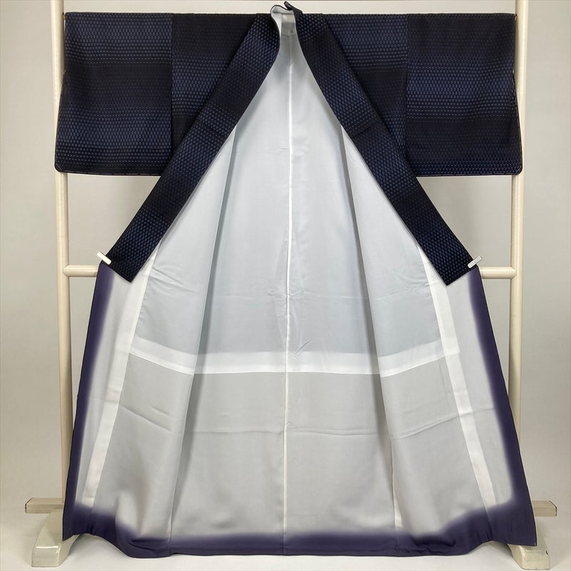 (中古) 御召 紺 黒 カジュアル 秦流舎 市松 袷 絹 【身丈】161cm【裄丈】71.5cm