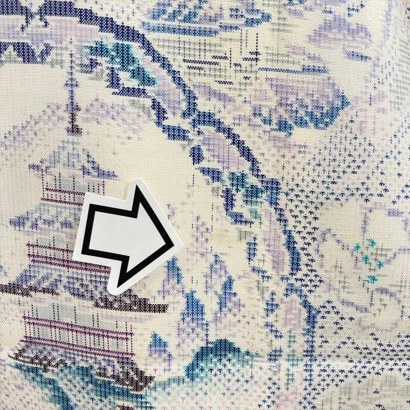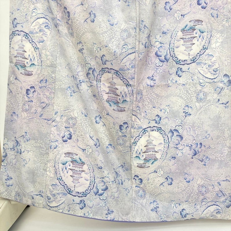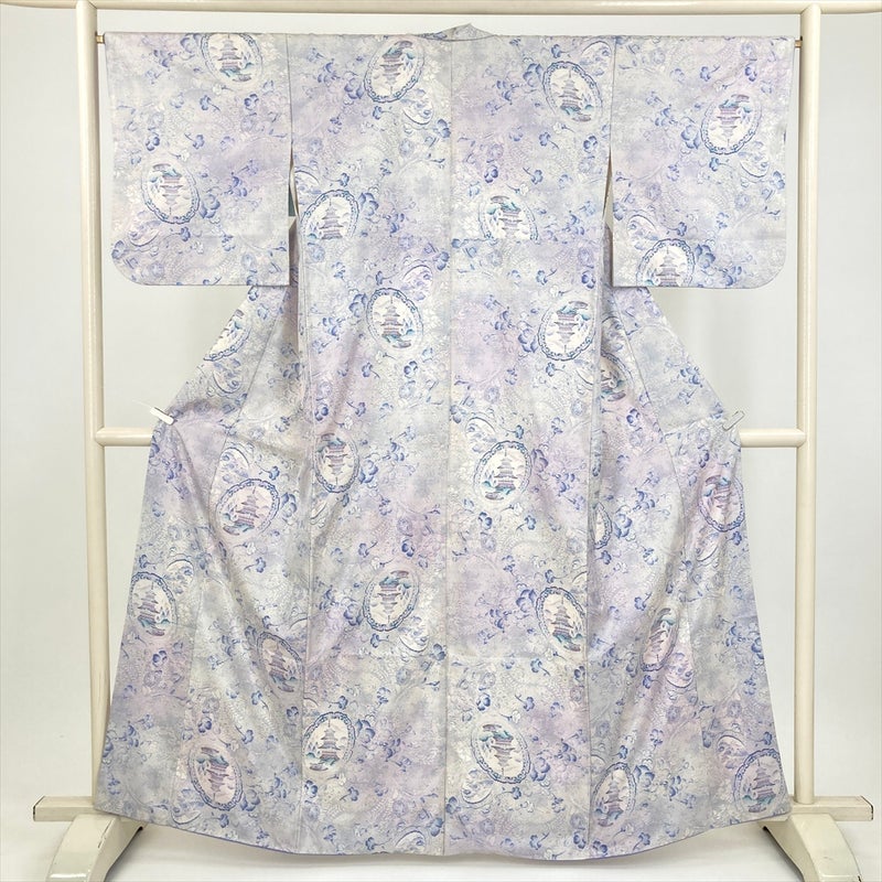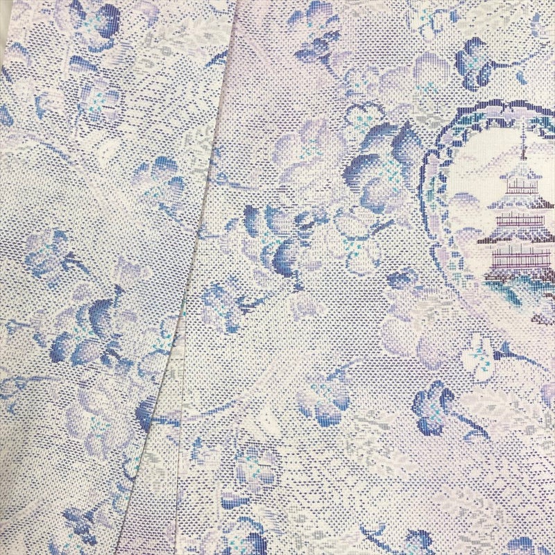 白地に青紫と藤色で寺と花文様を配した、大島紬ならではの品格ある一枚。
