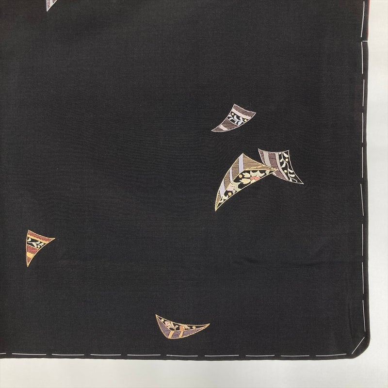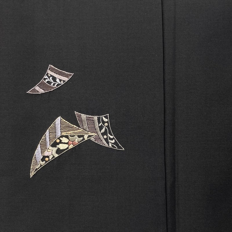 黒地に扇面を思わせる刺繍柄が映える、大島紬の上質な一枚。