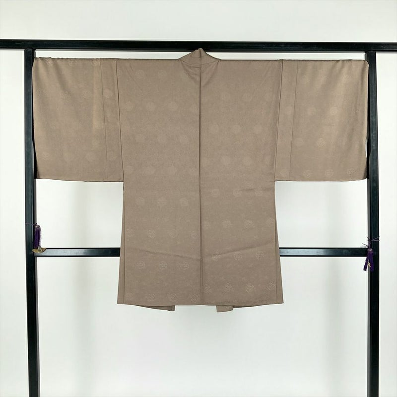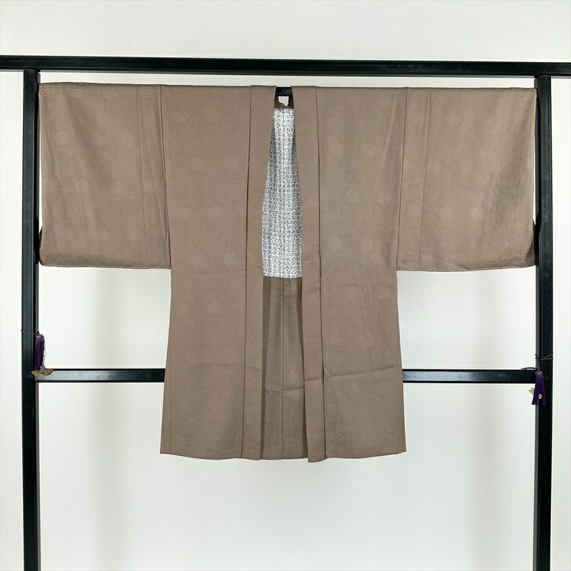 一点ものの羽織です。上質な正絹の地紋織りが、落ち着いた薄茶色に奥行きを与え、品格ある佇まいを演出します。